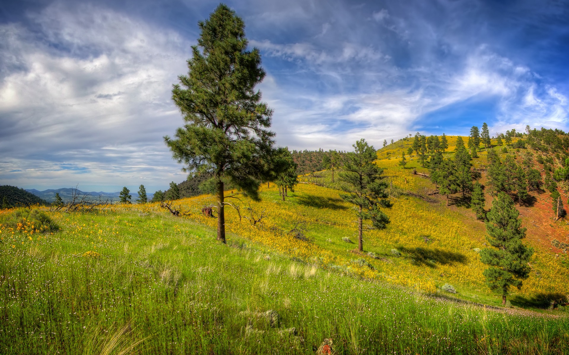 Description: A grassy hill with trees and flowers on it and a cloudy sky above it with a few clouds in the sky.