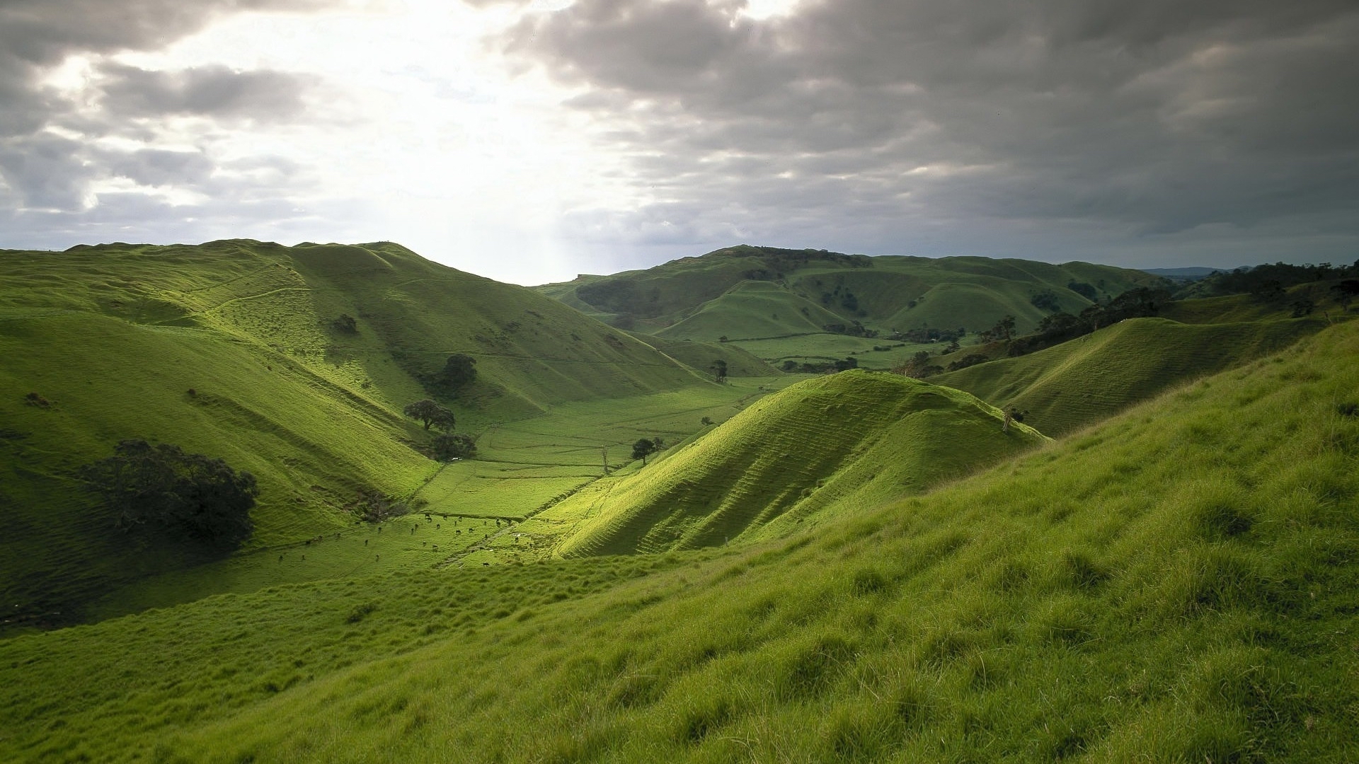 Description: A grassy valley with a few trees on the side of it and a cloudy sky above it.