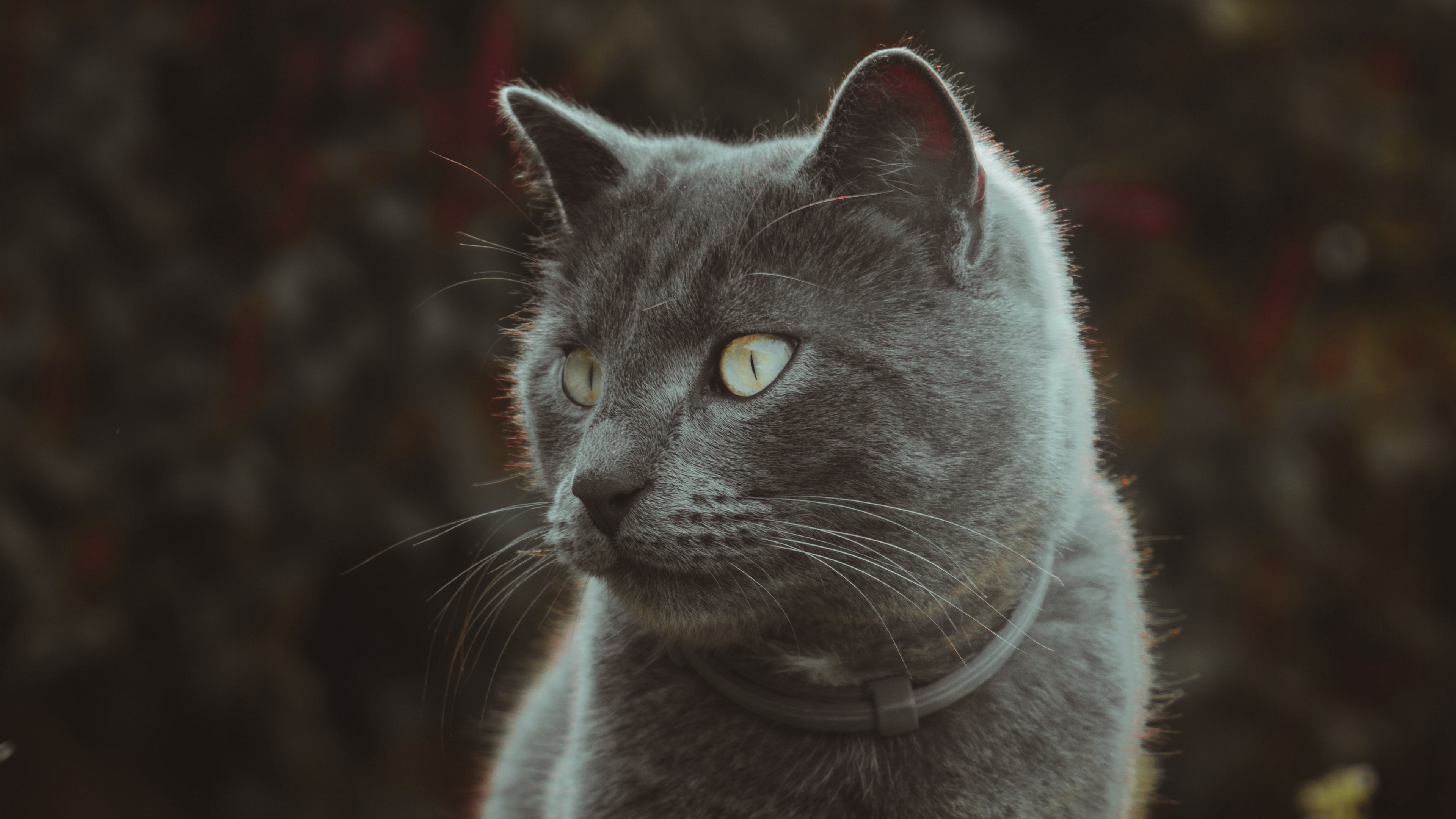 Description: A gray cat with a collar looking at the camera with a serious look on its face and chest.