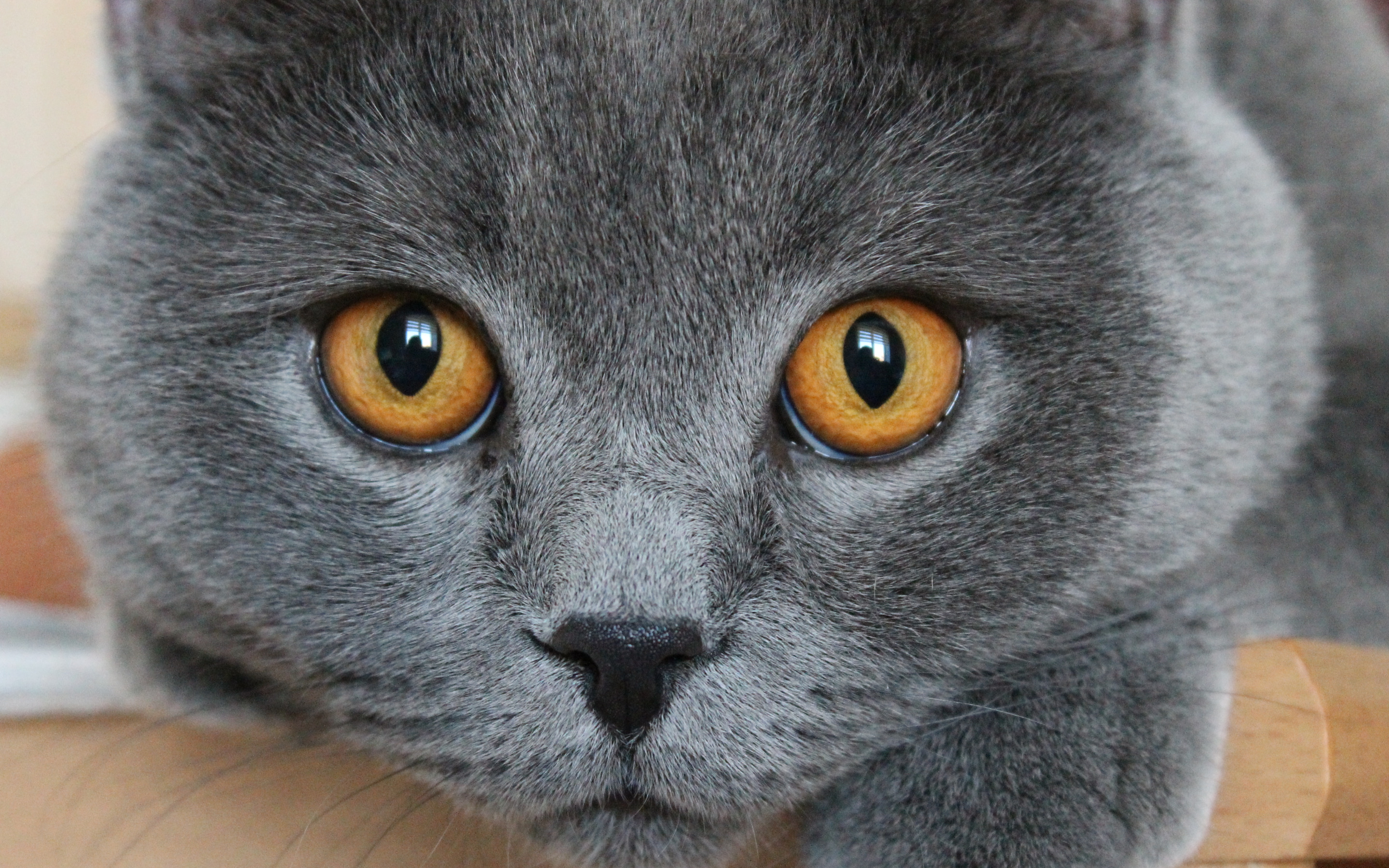 Description: A gray cat with yellow eyes laying on a table top looking at the camera with a curious look on its face.