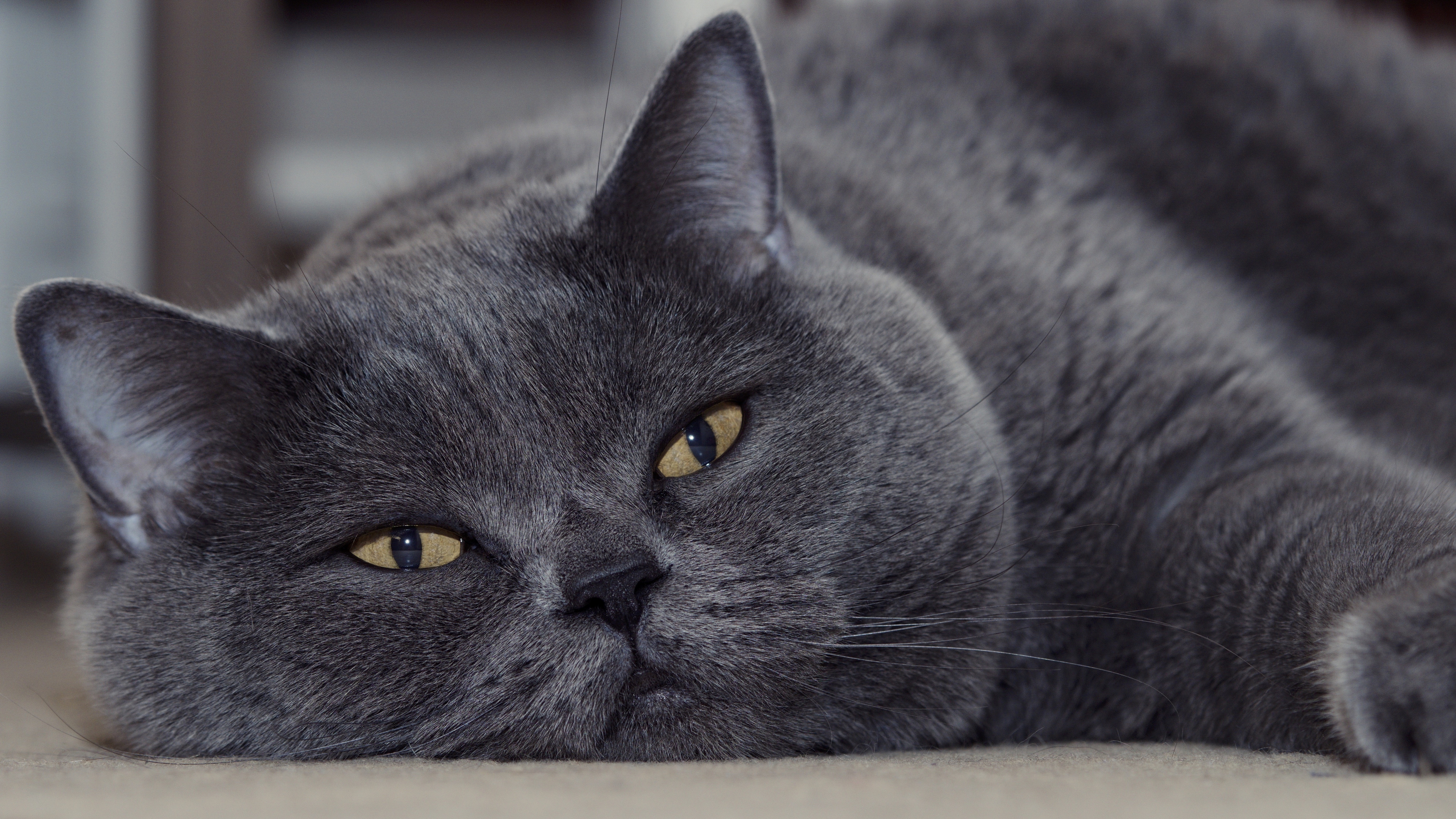 Description: A gray cat laying on the floor looking at the camera with a sad look on its face and eyes.