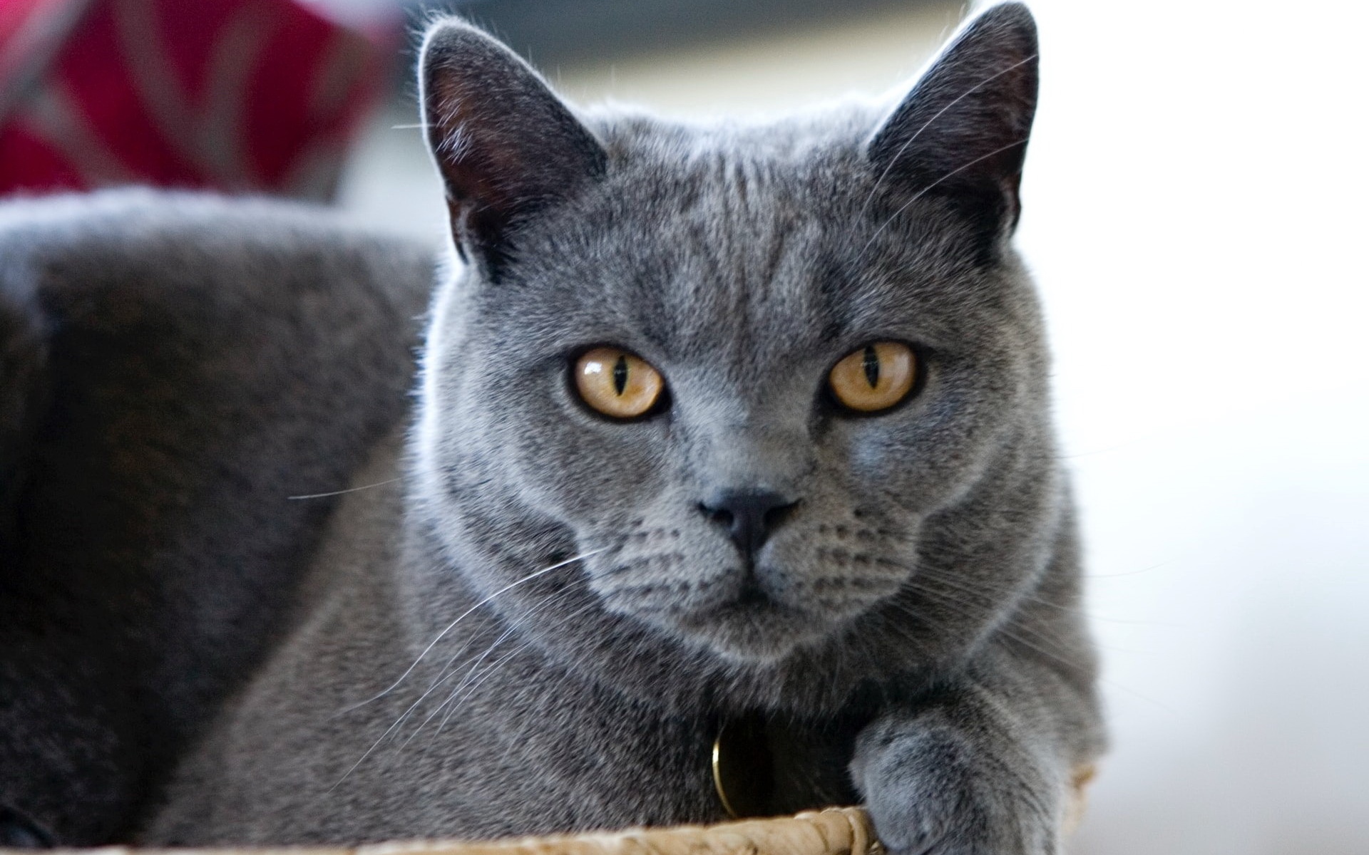 Description: A gray cat with yellow eyes sitting in a basket with a red chair in the background and a red chair in the foreground.