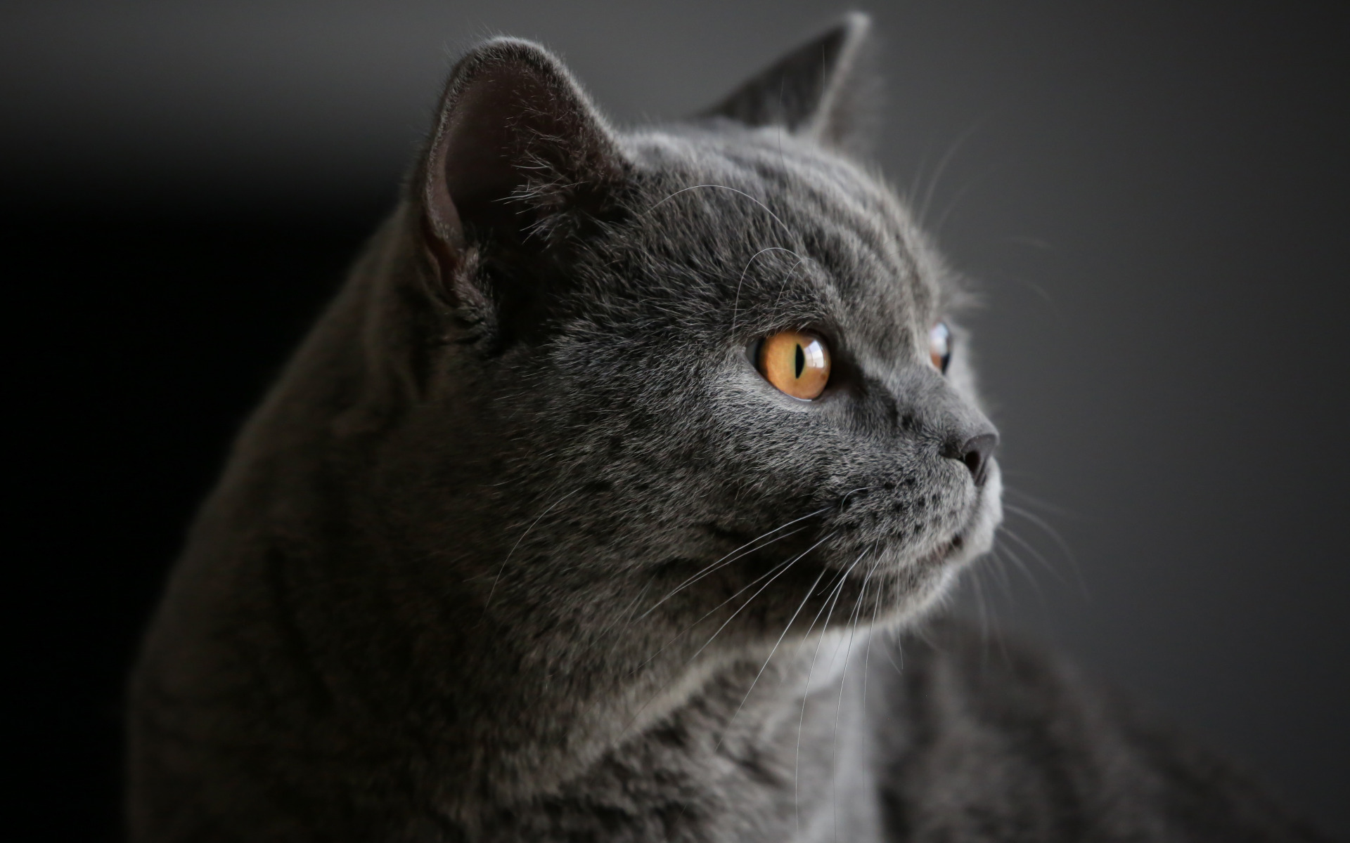 Description: A gray cat with yellow eyes looking up at something in the distance with a black background and a white wall.