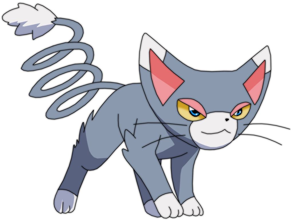 Description: A gray cat with yellow eyes and a red nose and tail with a spiral tail on its head and a black background.