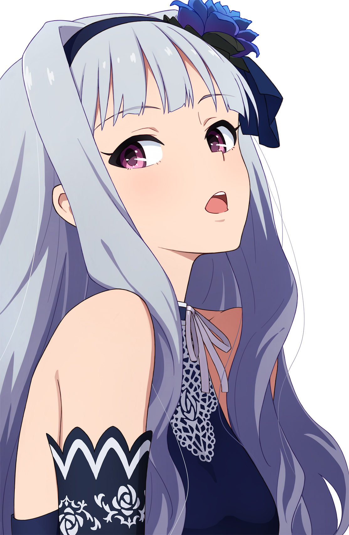 Description: A woman with long gray hair and a blue dress with a bow on her head and a black and white top.