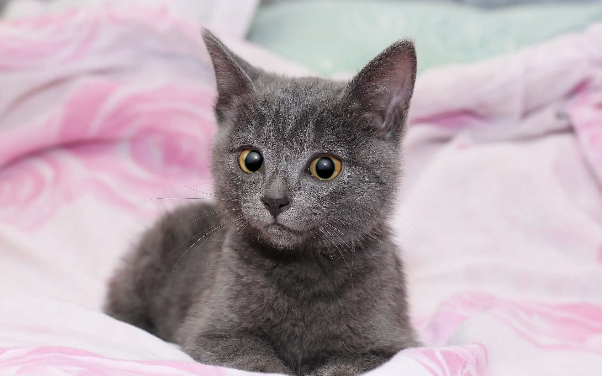 Description: A gray kitten laying on a pink blanket looking at the camera with a curious look on its face and eyes.