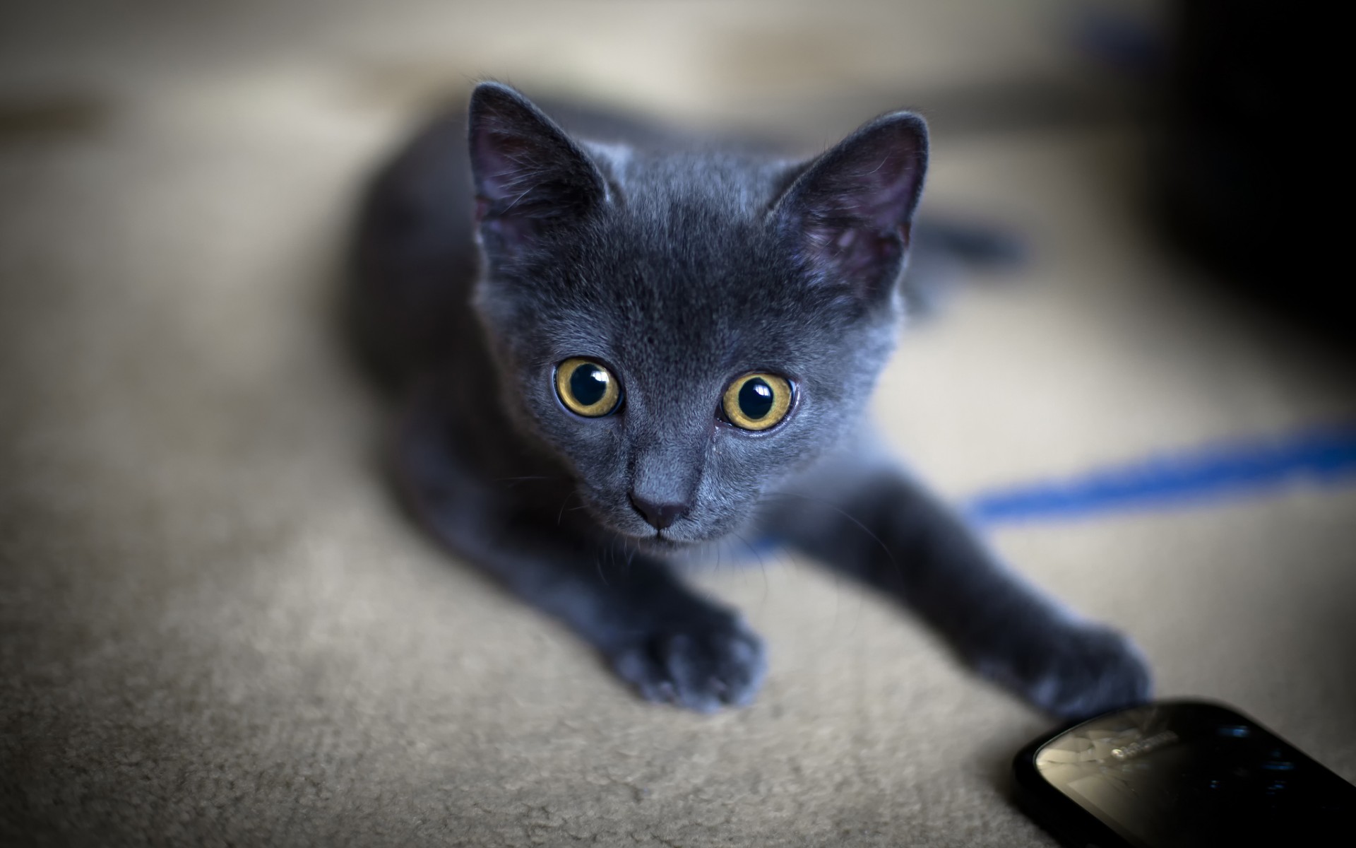 Description: A small gray kitten laying on the floor next to a cell phone with a yellow eye looking at the camera.