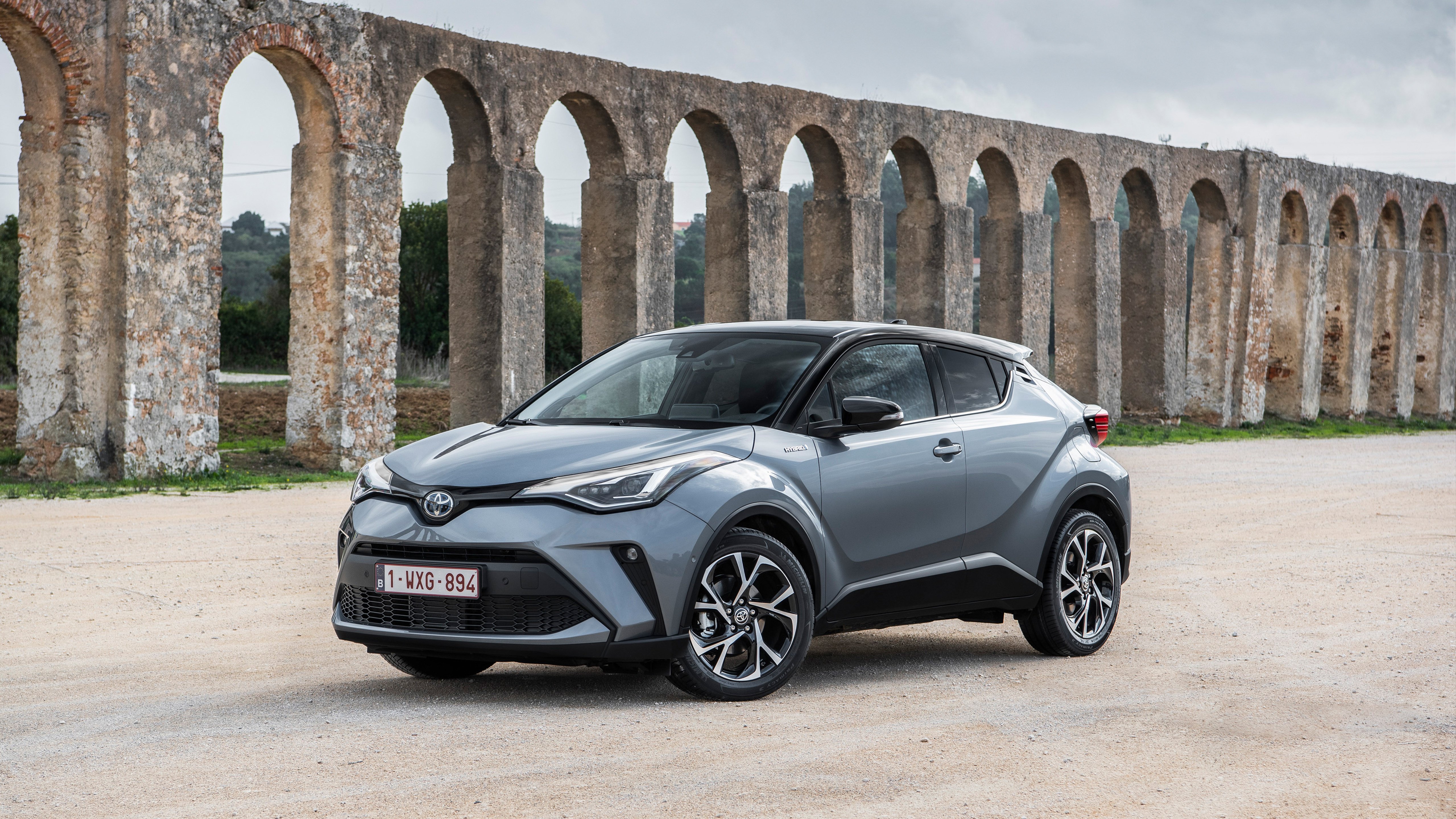 Description: A gray toyota c - hr parked in front of a stone wall and arches in a city area with a stone wall in the background.