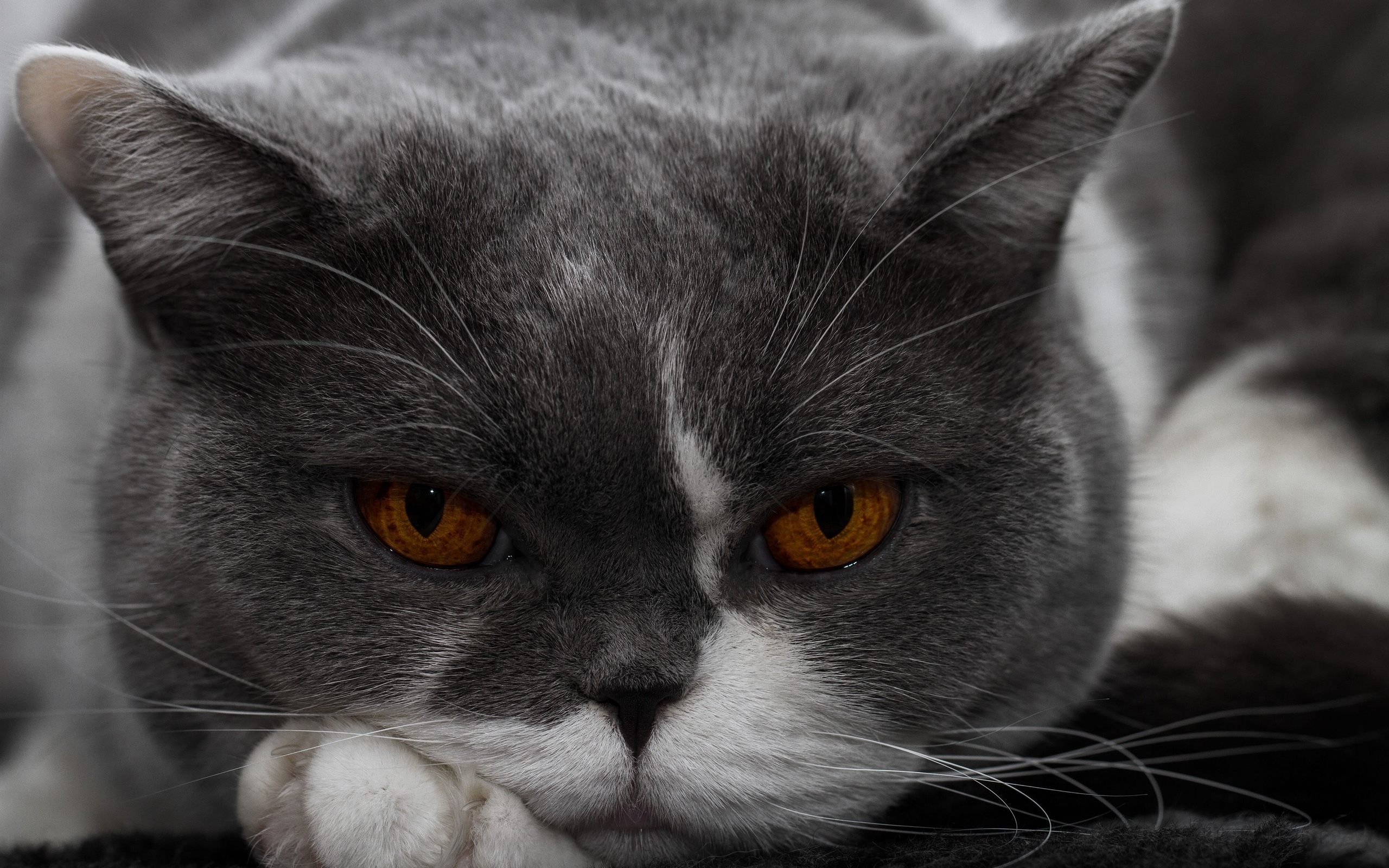 Description: A gray and white cat with orange eyes laying on a black blanket looking at the camera with a sad look on its face.