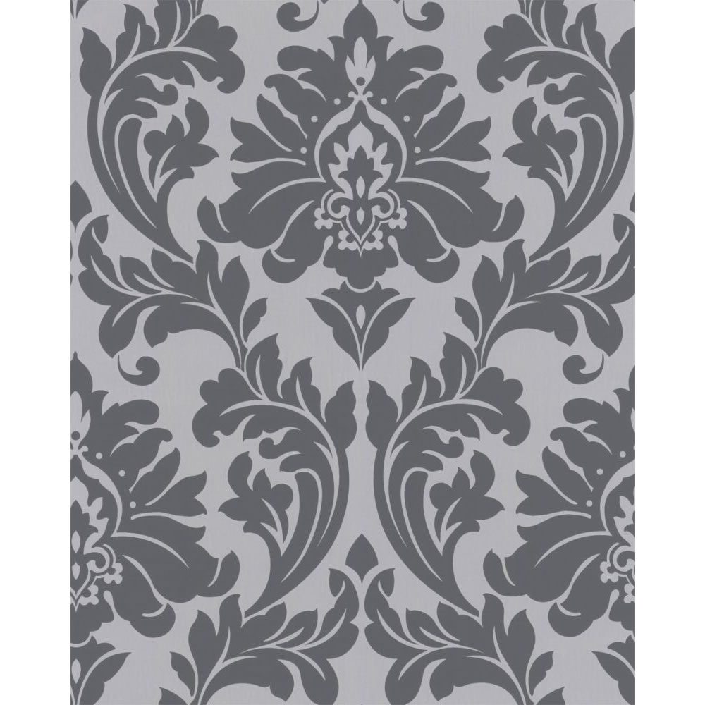 Description: A gray and white wallpaper with a large flower pattern on it's side.