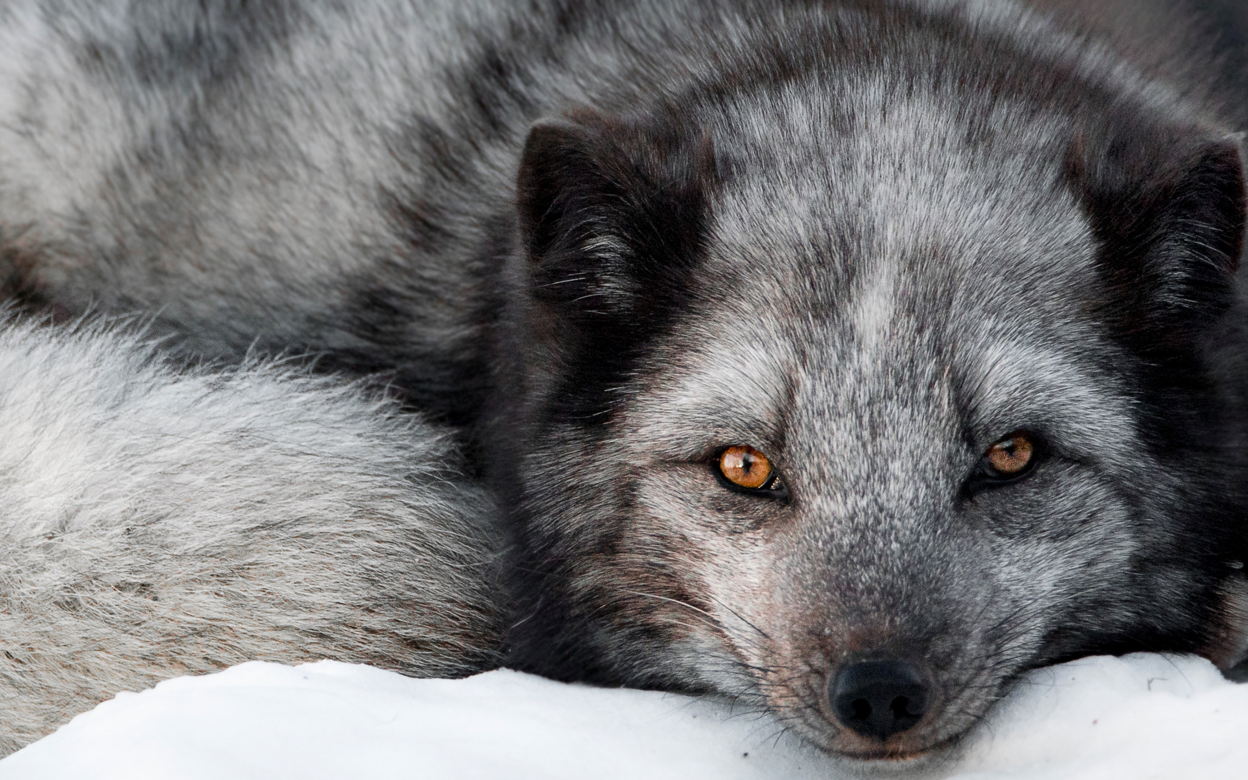 Description: A gray wolf laying down on a white blanket looking at the camera with a sad look on his face.