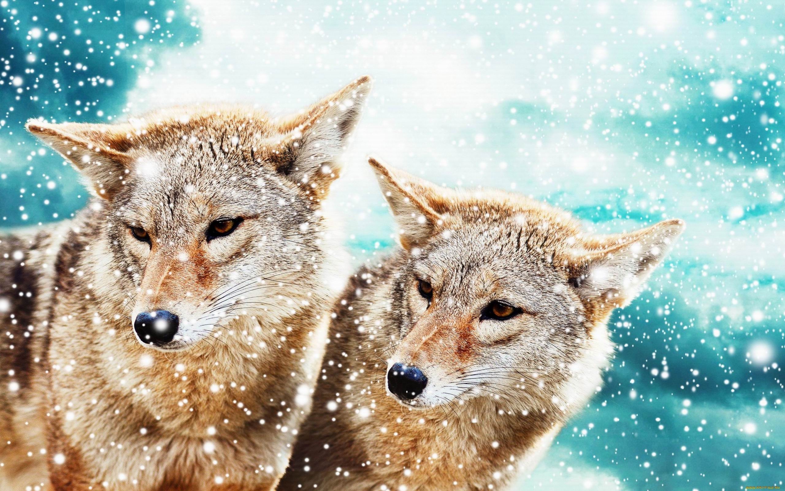 Description: Two gray wolfs standing in the snow with their eyes closed and their eyes closed.