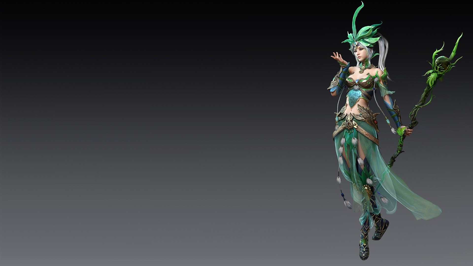 Description: A woman dressed in a costume with a green hair and a green dress holding a green plant in her hand.