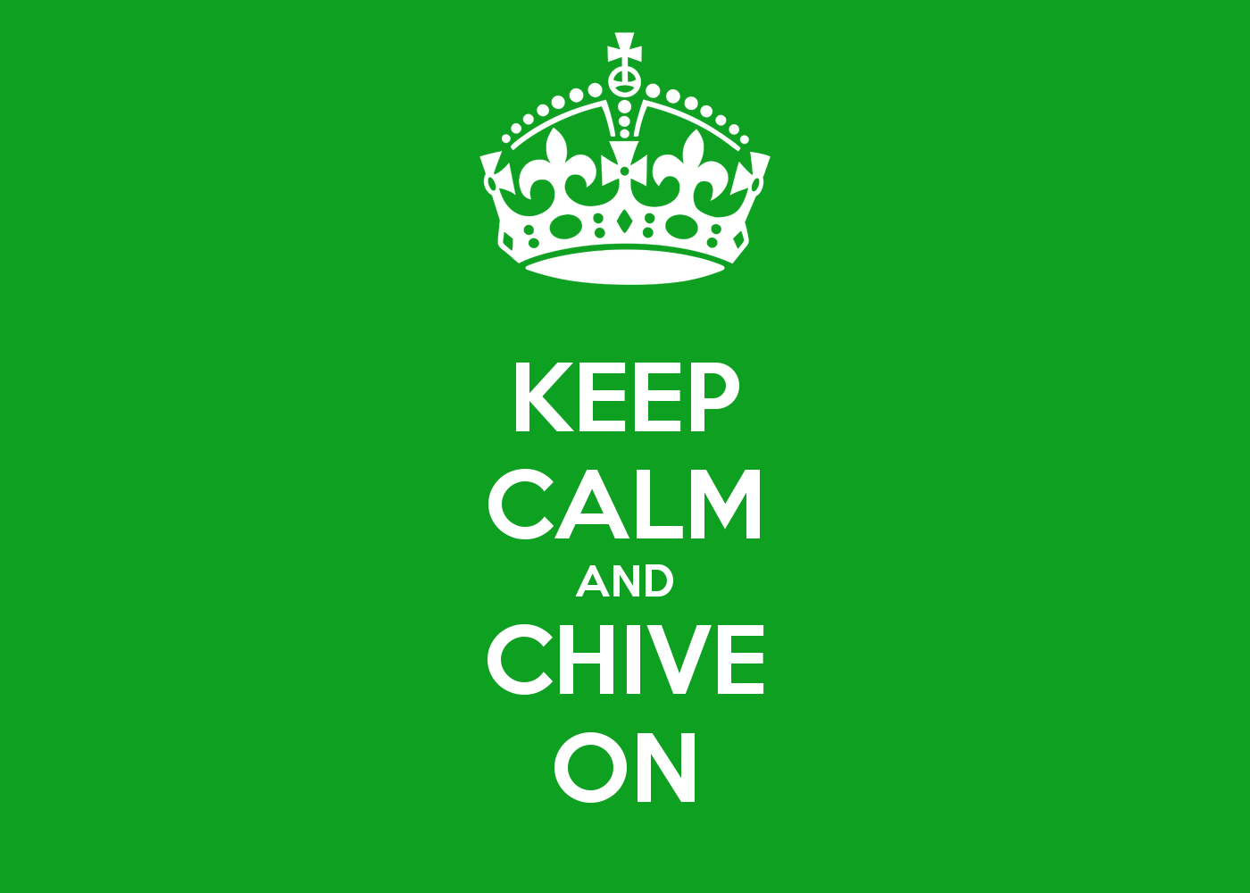 Description: A green background with a white keep calm and chive on sign on it.