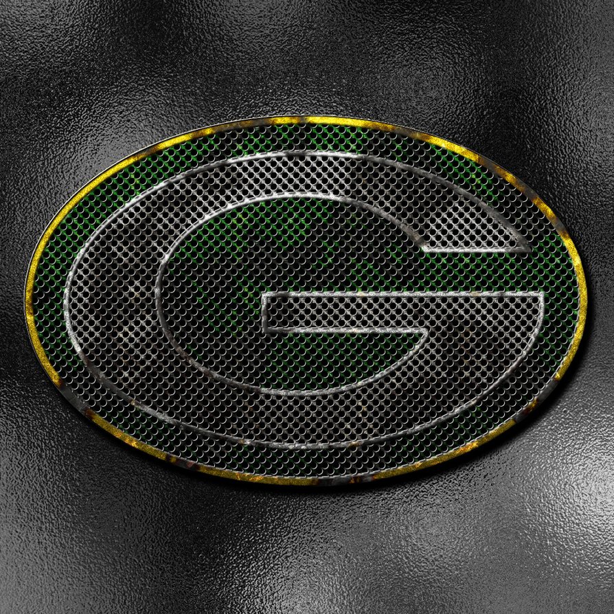 Description: A green bay packers logo on a black background with a green and yellow stripe on the bottom of the circle.