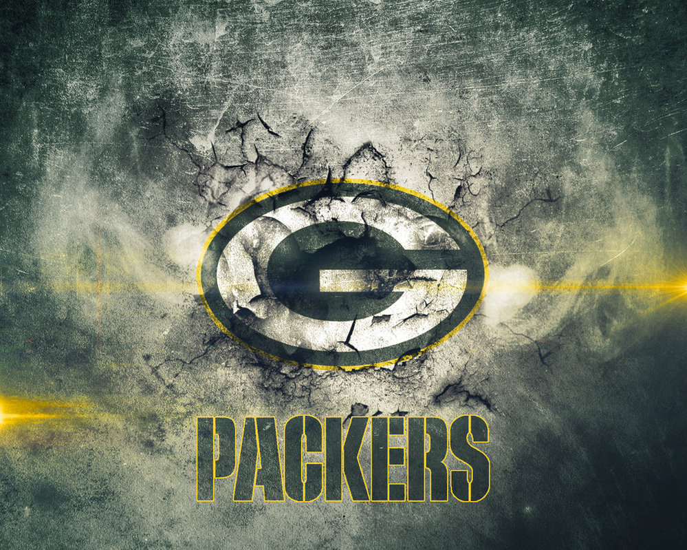 Description: A green bay packers logo on a grungy background with yellow lights and a grungy background.