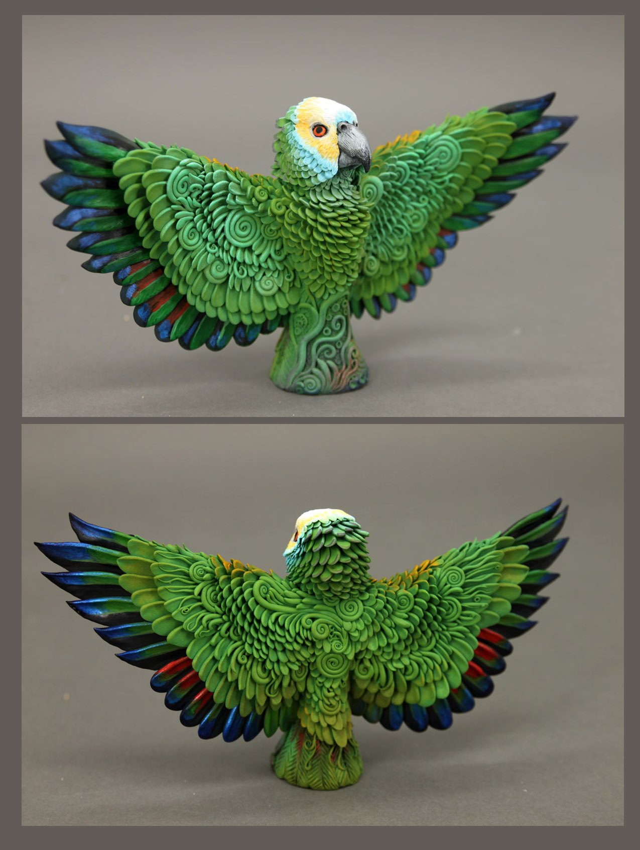 Description: A green bird with blue wings and a yellow beak and a green body with yellow eyes and a white head.