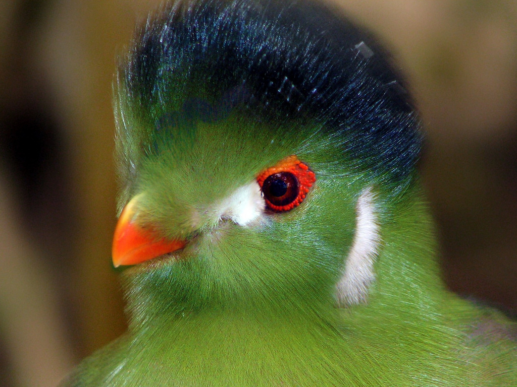 Description: A close up of a green bird with a red eye and a black head and neck with a blurry background.