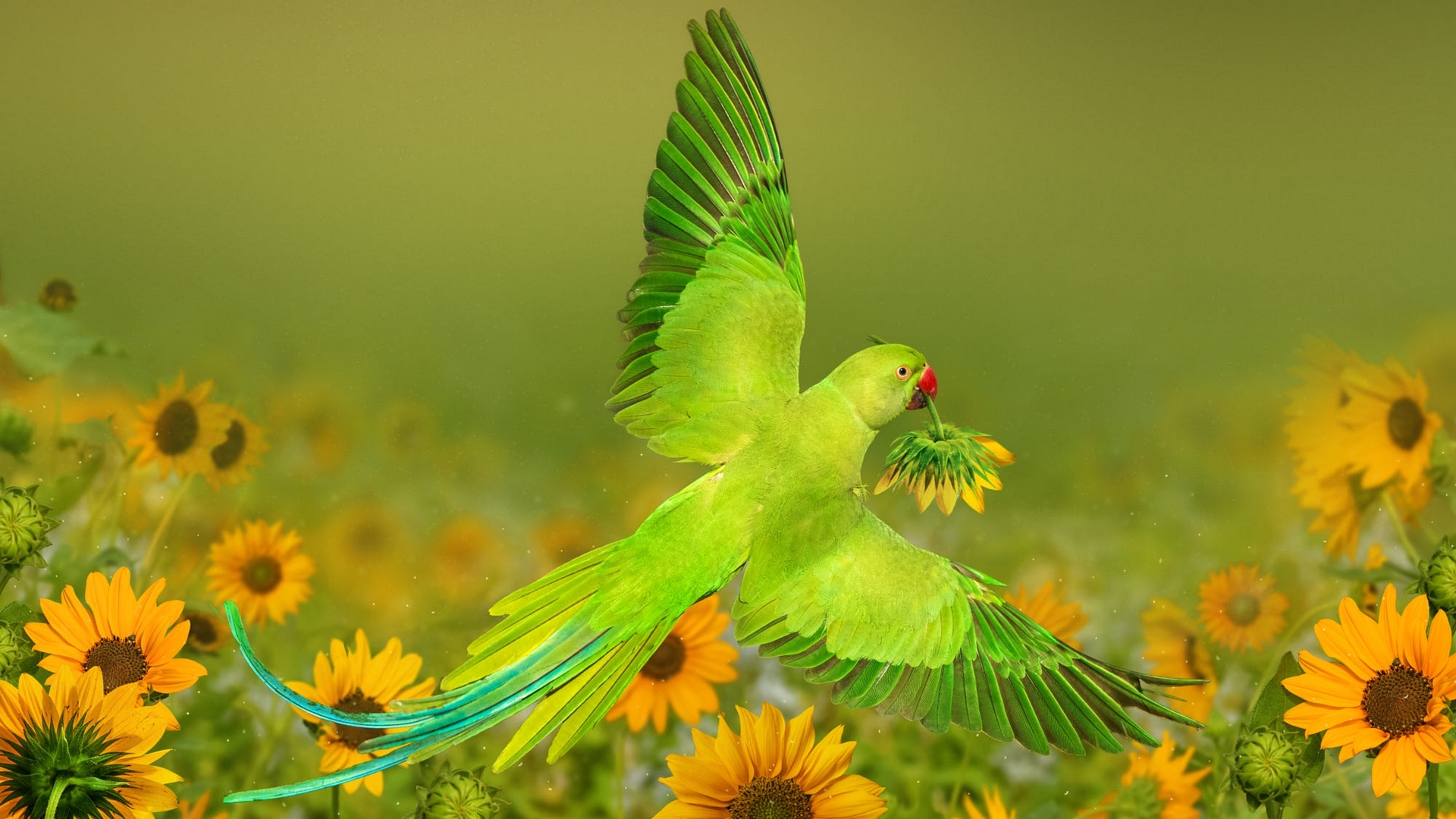 Description: A green bird flying over a field of yellow flowers with a green background and a green background with yellow flowers.