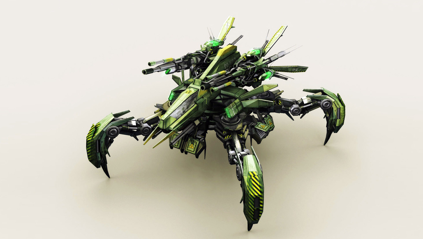 Description: A green and black robot like object on a white background with a shadow of the robot on the ground.