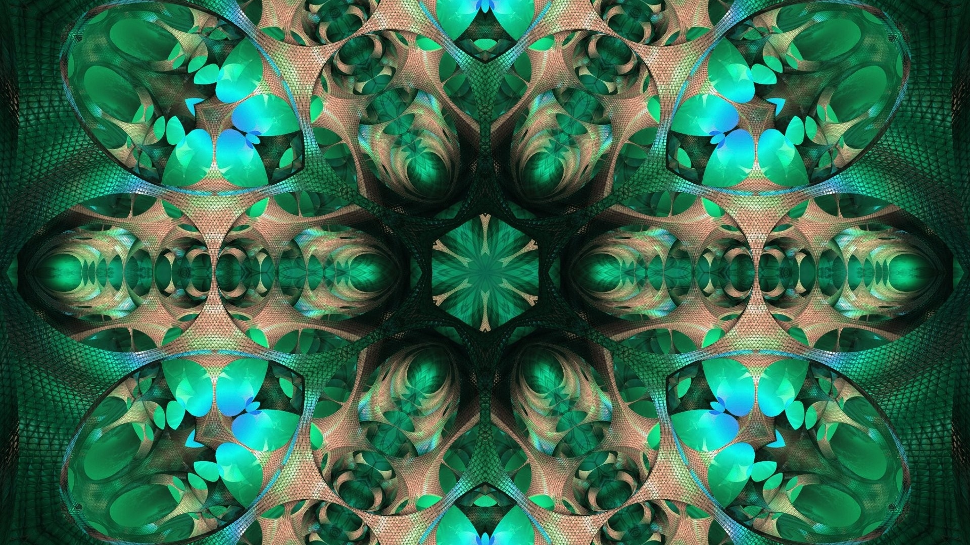 Description: A green and blue abstract design with a large flower in the center of the image.