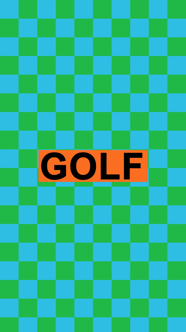 Description: A green and blue checkered background with a black golf marker on it's side and a black and orange stripe across the top of the word.