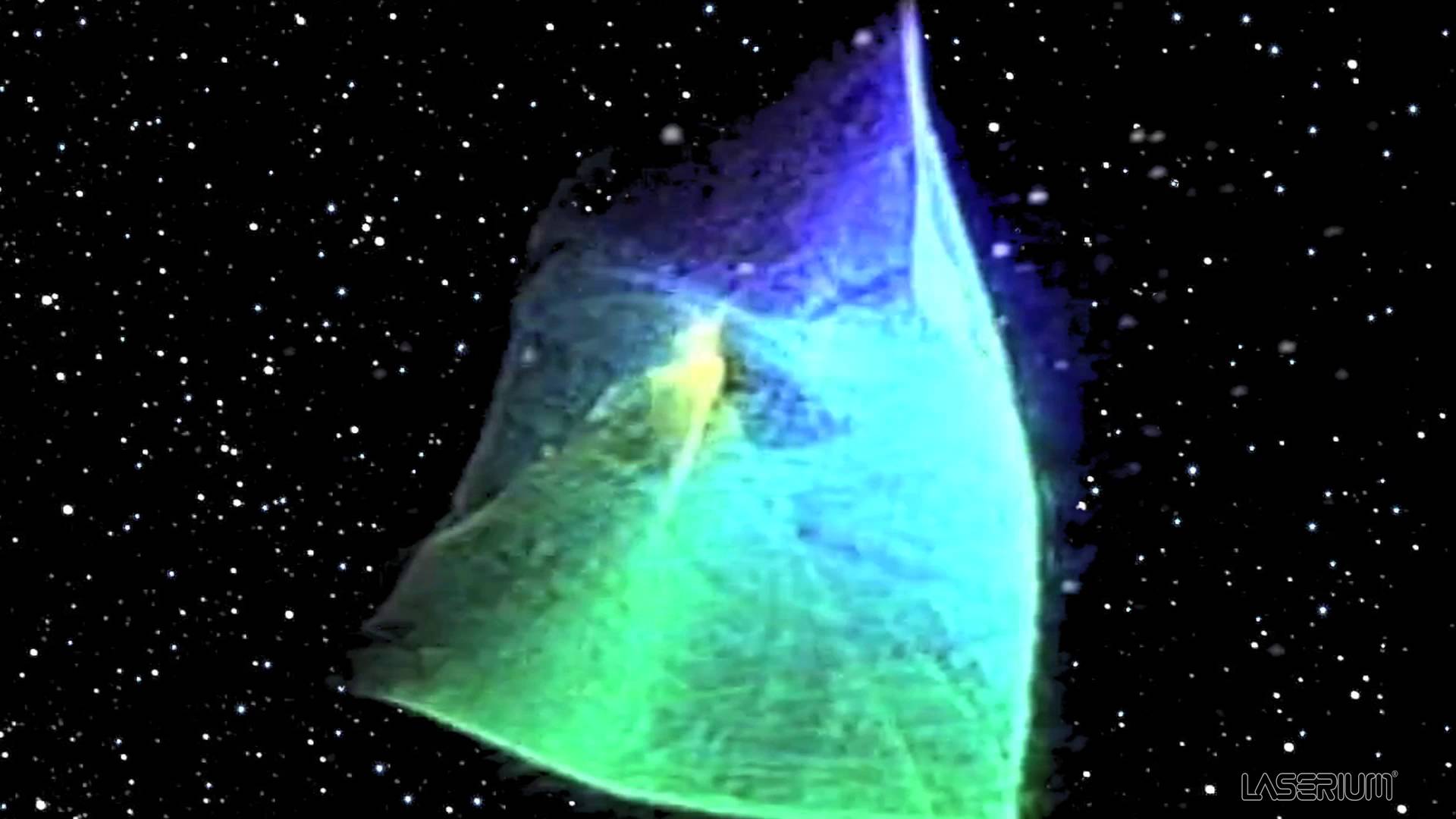 Description: A green and blue object in the dark sky with stars around it and a black background with white dots.