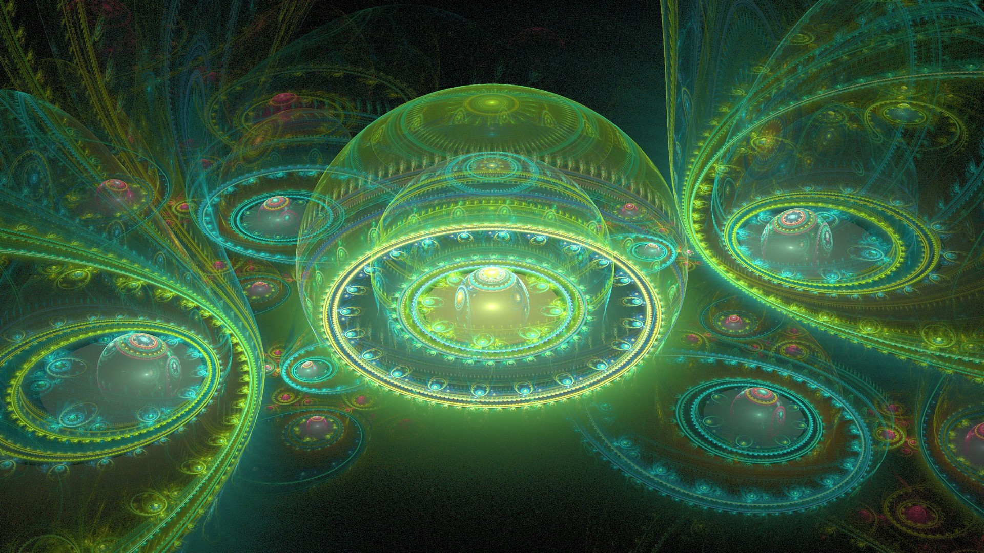Description: A computer generated image of a green and blue object with a yellow center surrounded by smaller circles of light.