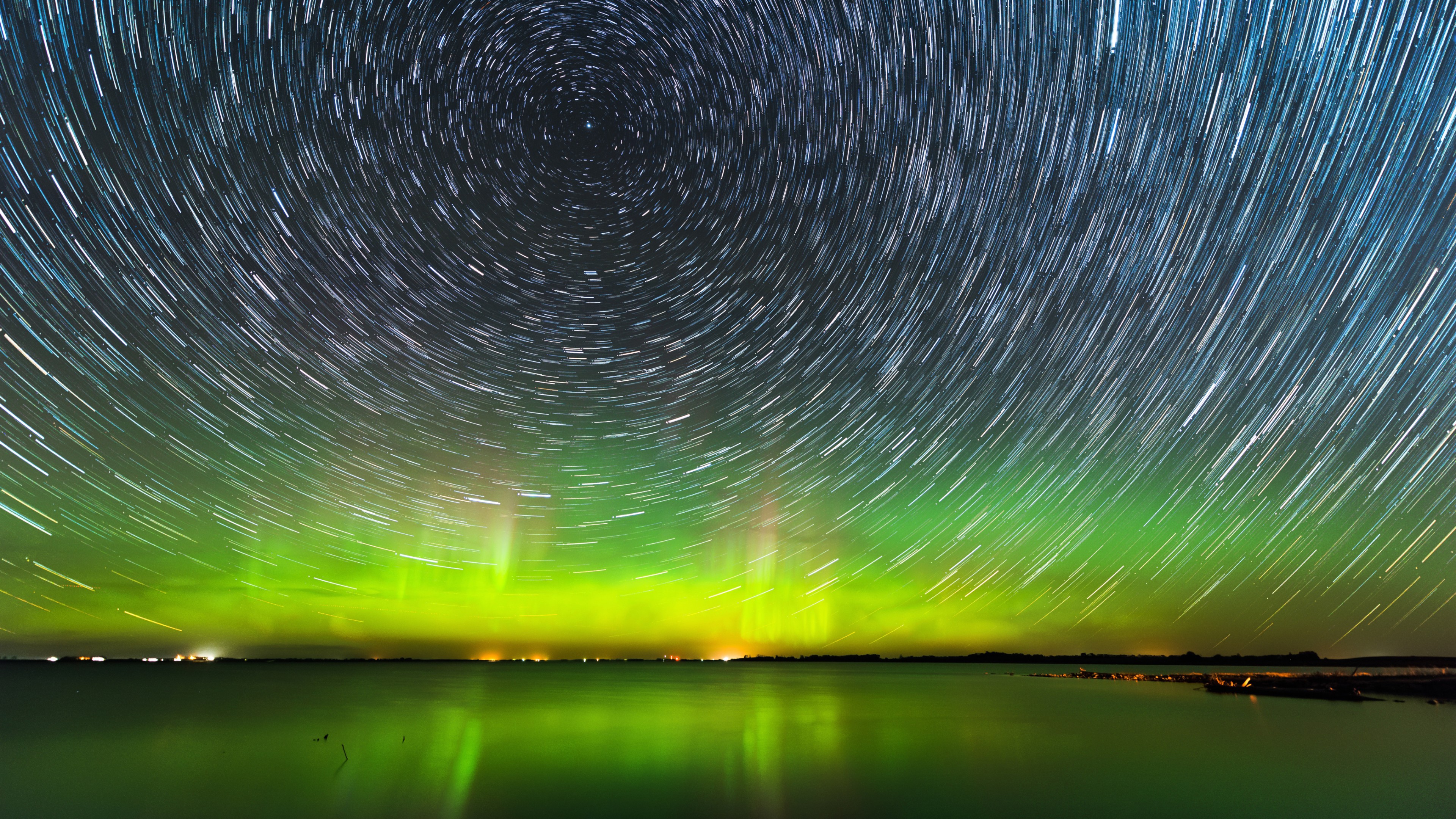 Description: A green and blue sky with stars and a lake in the foreground and a star trail in the sky.