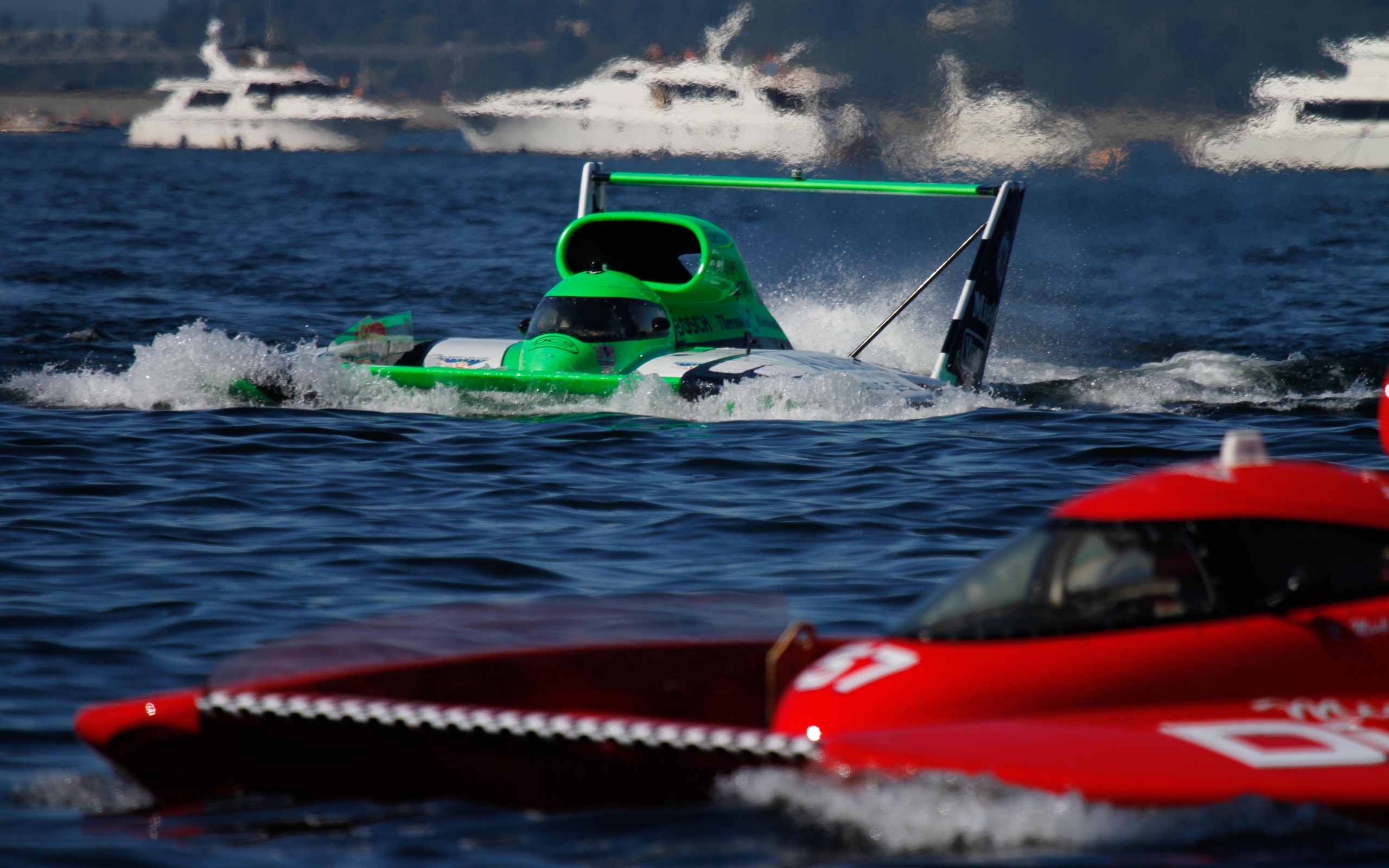 Description: A green boat is in the water with a red boat behind it and a red boat in the water.