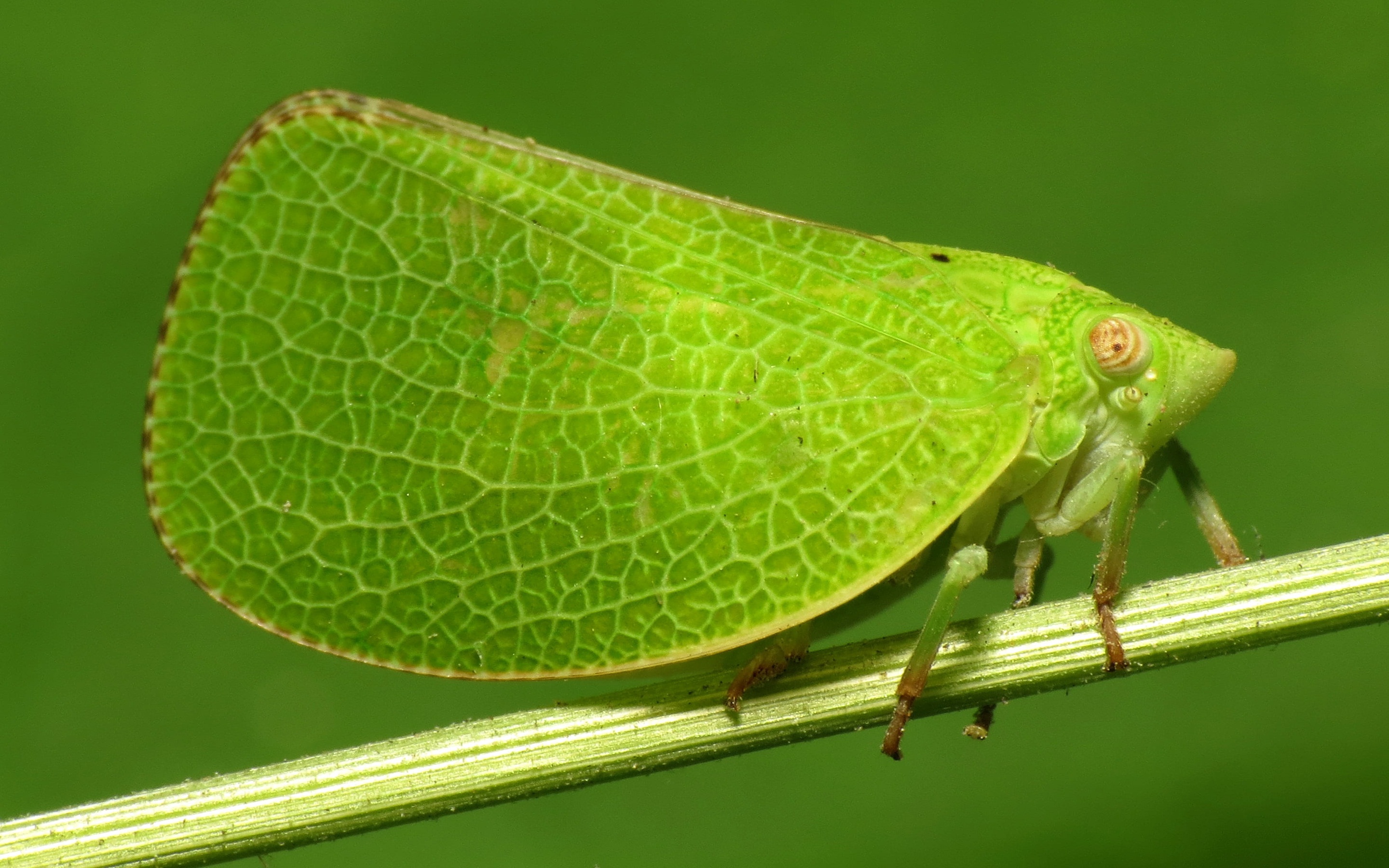 Description: A green bug sitting on top of a green plant stem with a green background and a small yellow bug on the end of the stem.