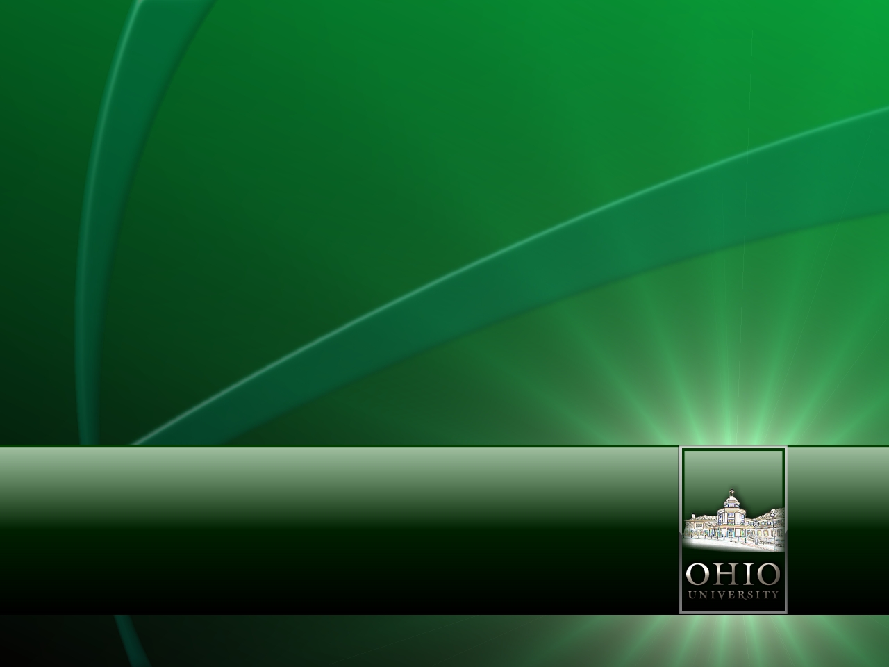 Description: A green background with a white building and a green ribbon on it's side and a black and white stripe on the bottom.