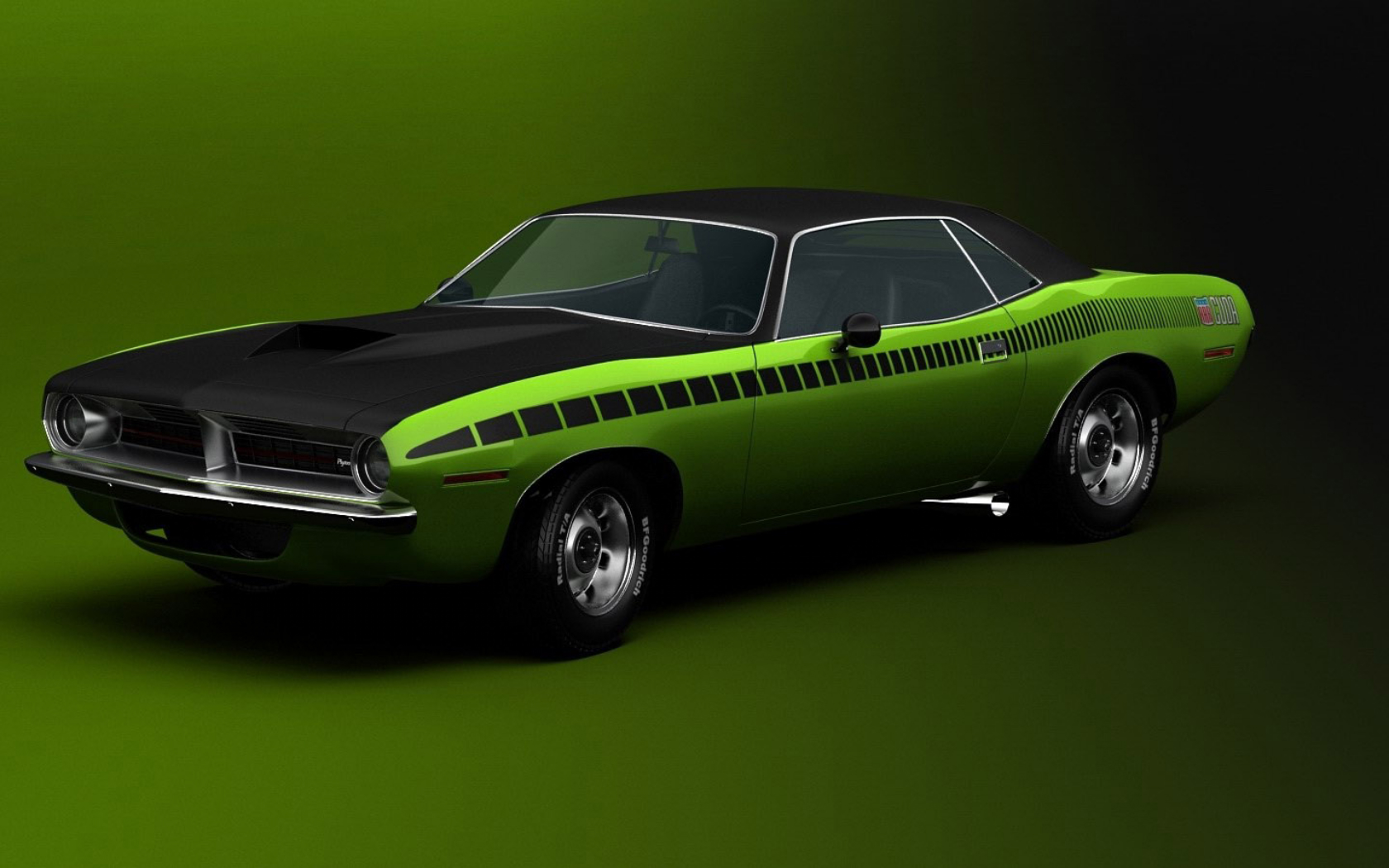 Description: A green car with a black top and a black hood and stripes on it's hood is shown.