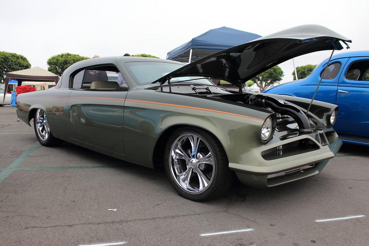 Description: A green car with a hood open in a parking lot next to a blue car with a hood up.