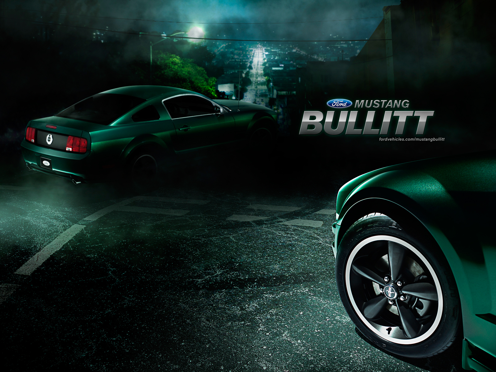 Description: A green car is parked in a parking lot at night with fog coming from the sky and a green mustang.