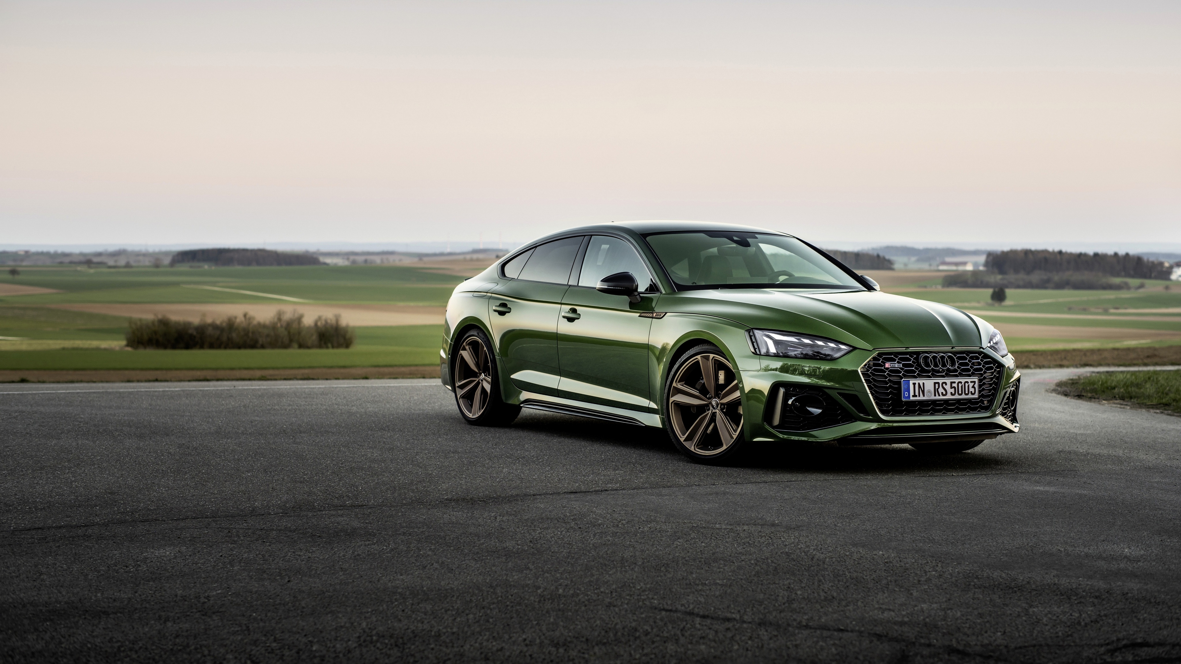 Description: A green car parked on a road near a field of grass and trees in the background.