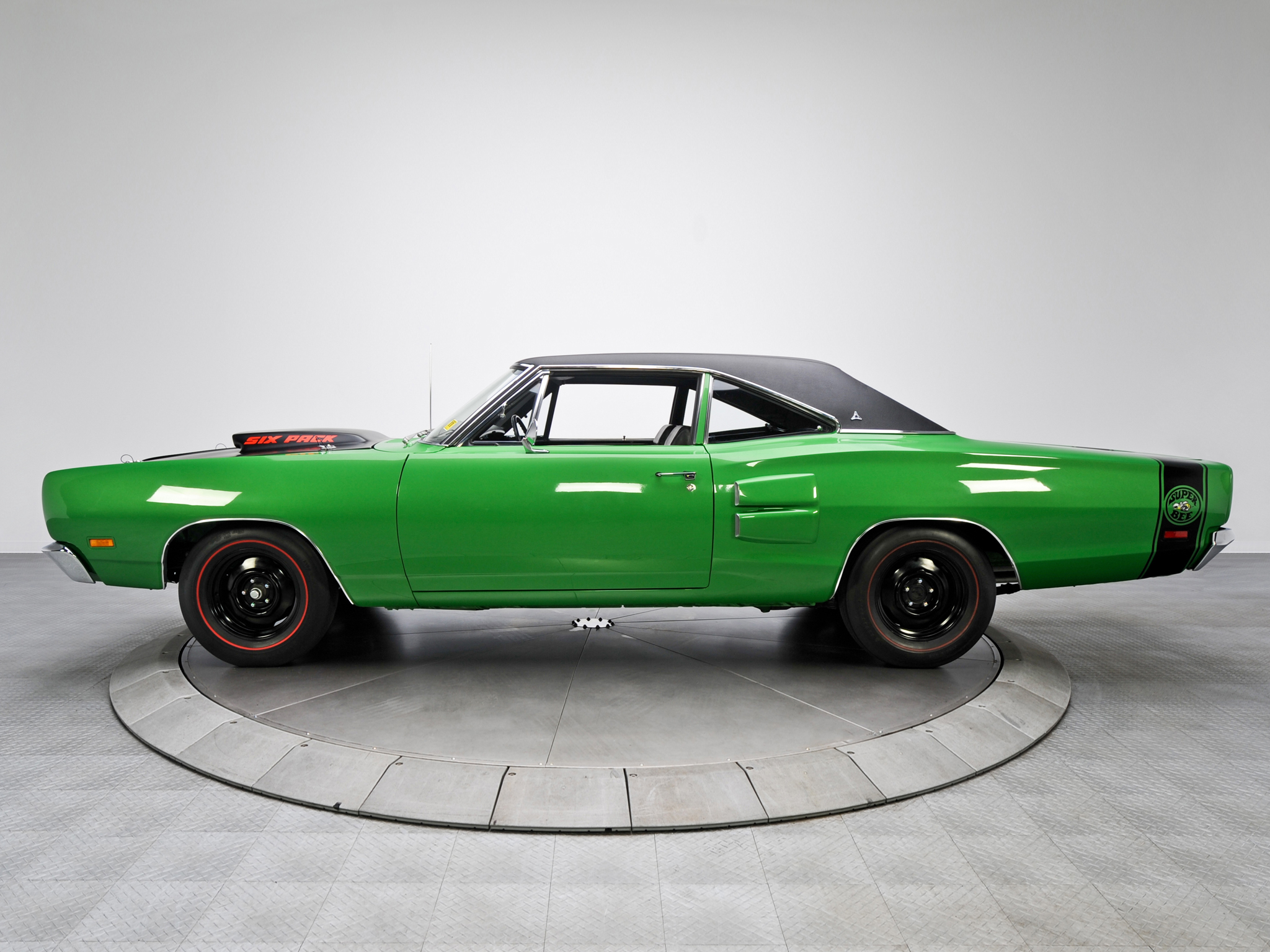 Description: A green car is sitting on a round platform in a room with a white wall and a black top.