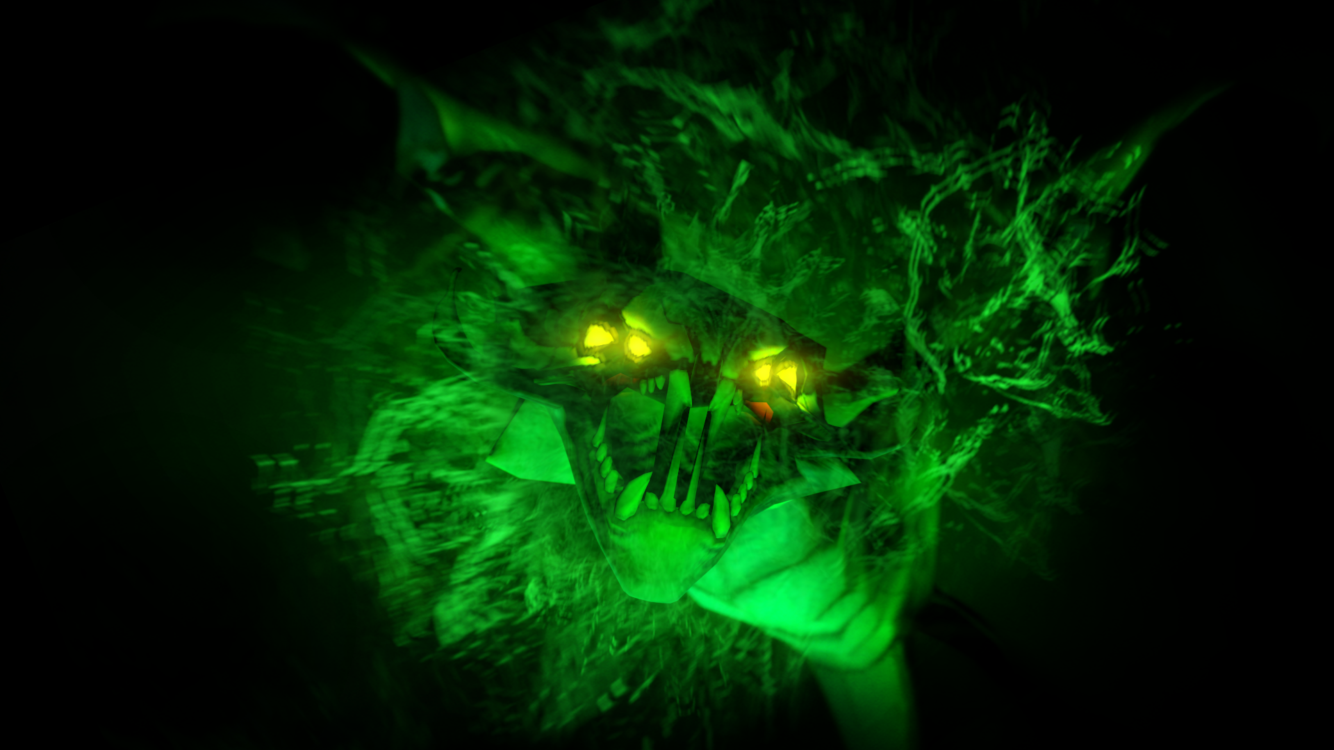 Description: A green cat with glowing eyes and glowing hair in the dark.