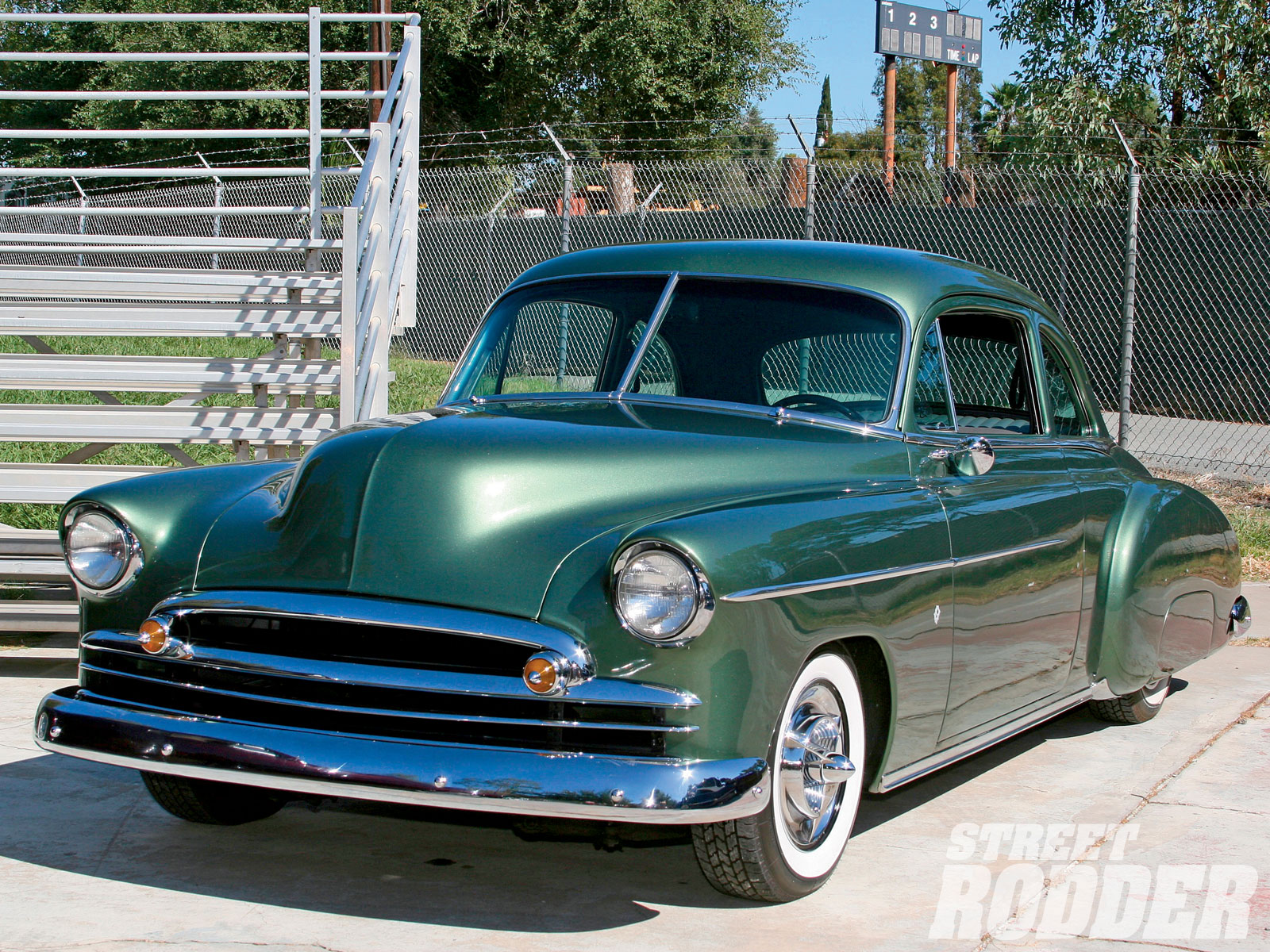 Description: A green classic car parked in front of a fenced in area with a metal fence and a metal fence.