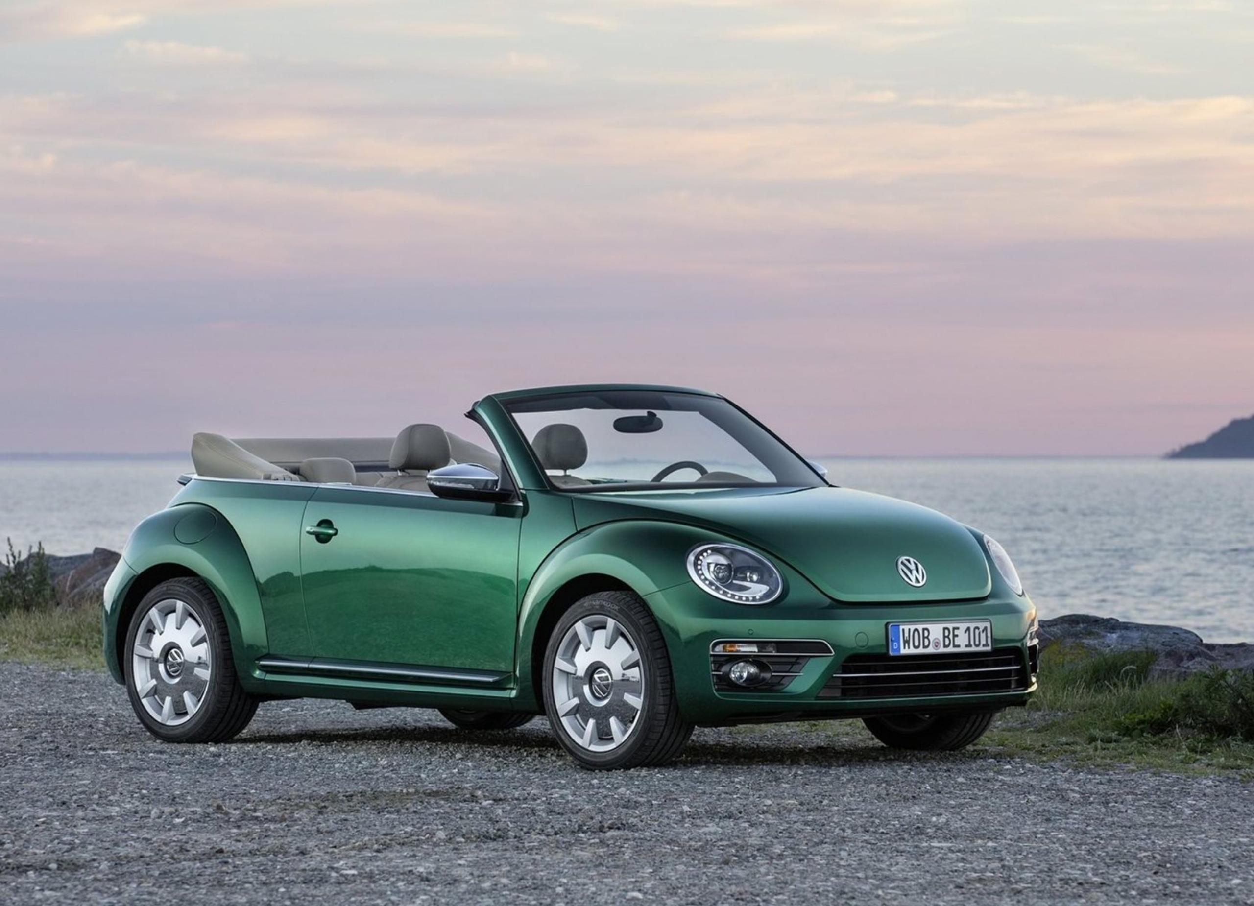 Description: A green convertible car parked on a gravel road next to the ocean and a rock shore with a pink sky.