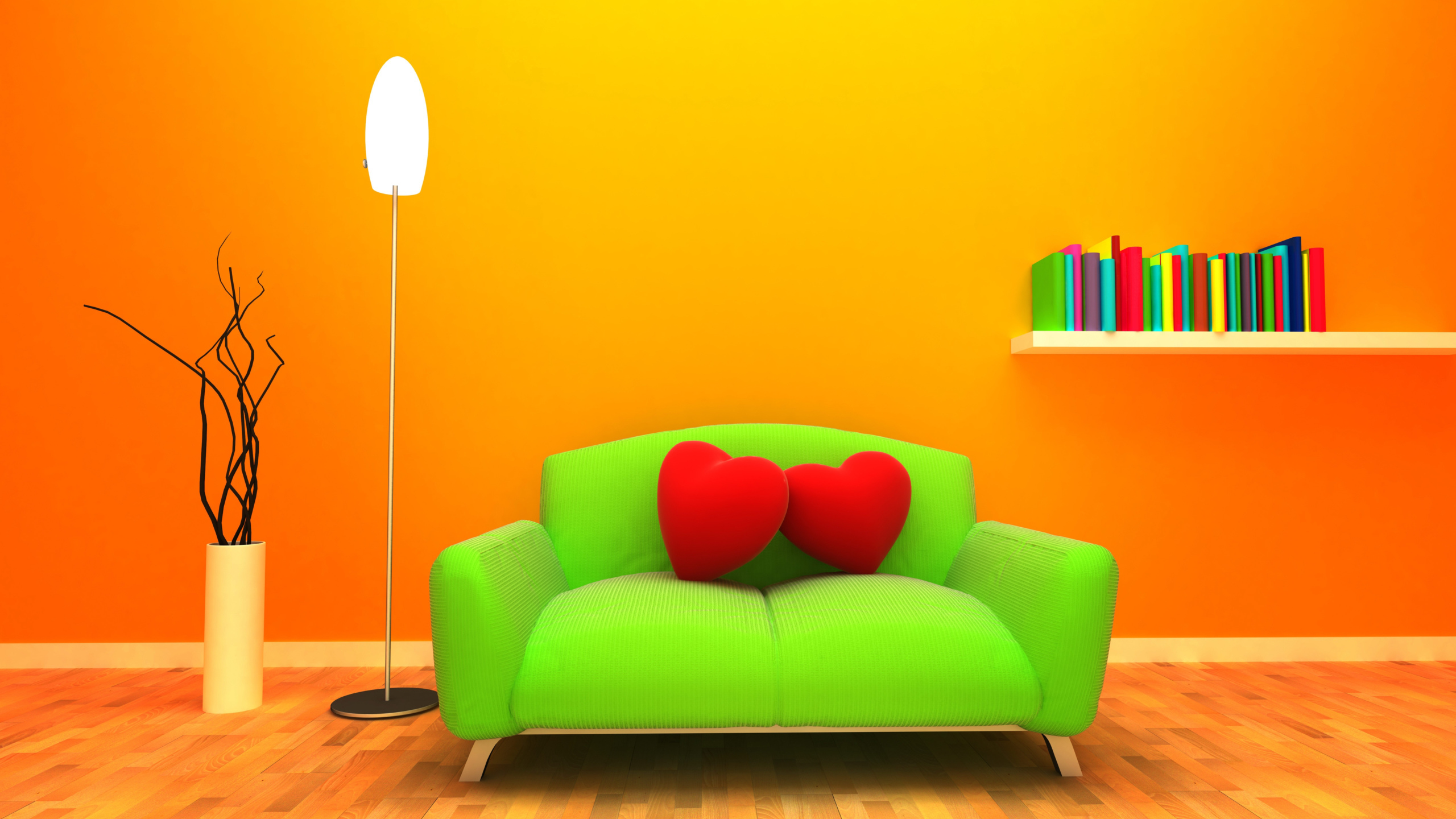 Description: A green couch with two red pillows in a room with a yellow wall and a white floor lamp and a book shelf.