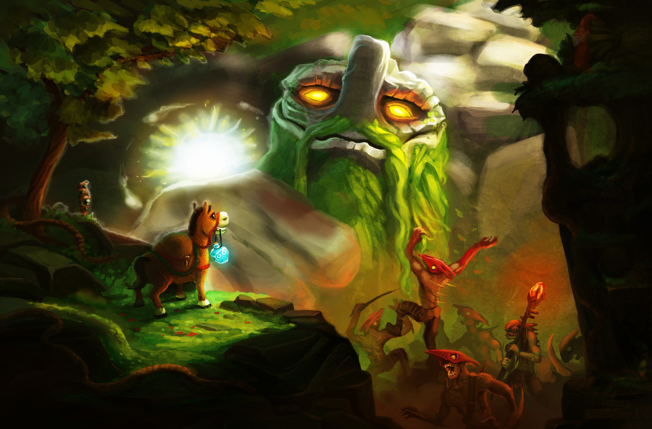 Description: A painting of a green creature with glowing eyes and a horse in the background with a glowing light in his eyes.