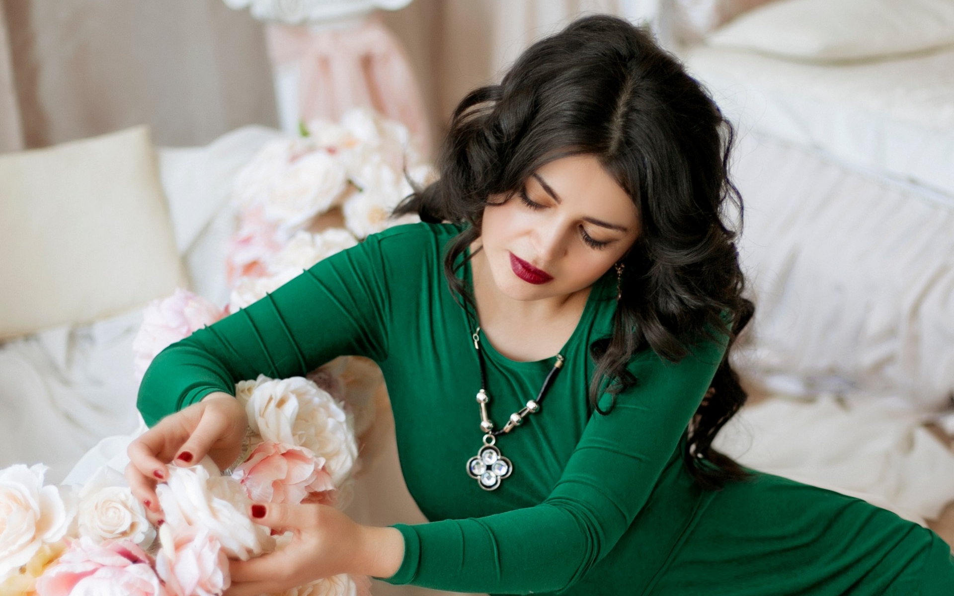 Description: A woman in a green dress is arranging flowers on a bed of white sheets and pillows in a bedroom.