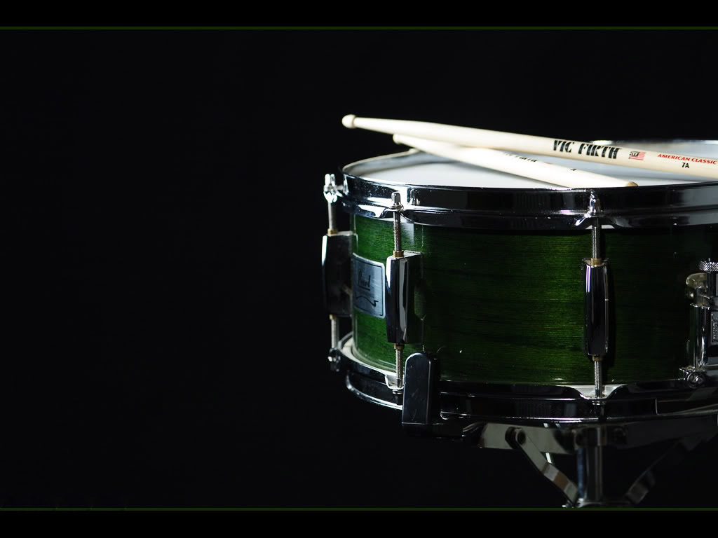 Description: A green drum with a pair of drumsticks on top of it in front of a black background.