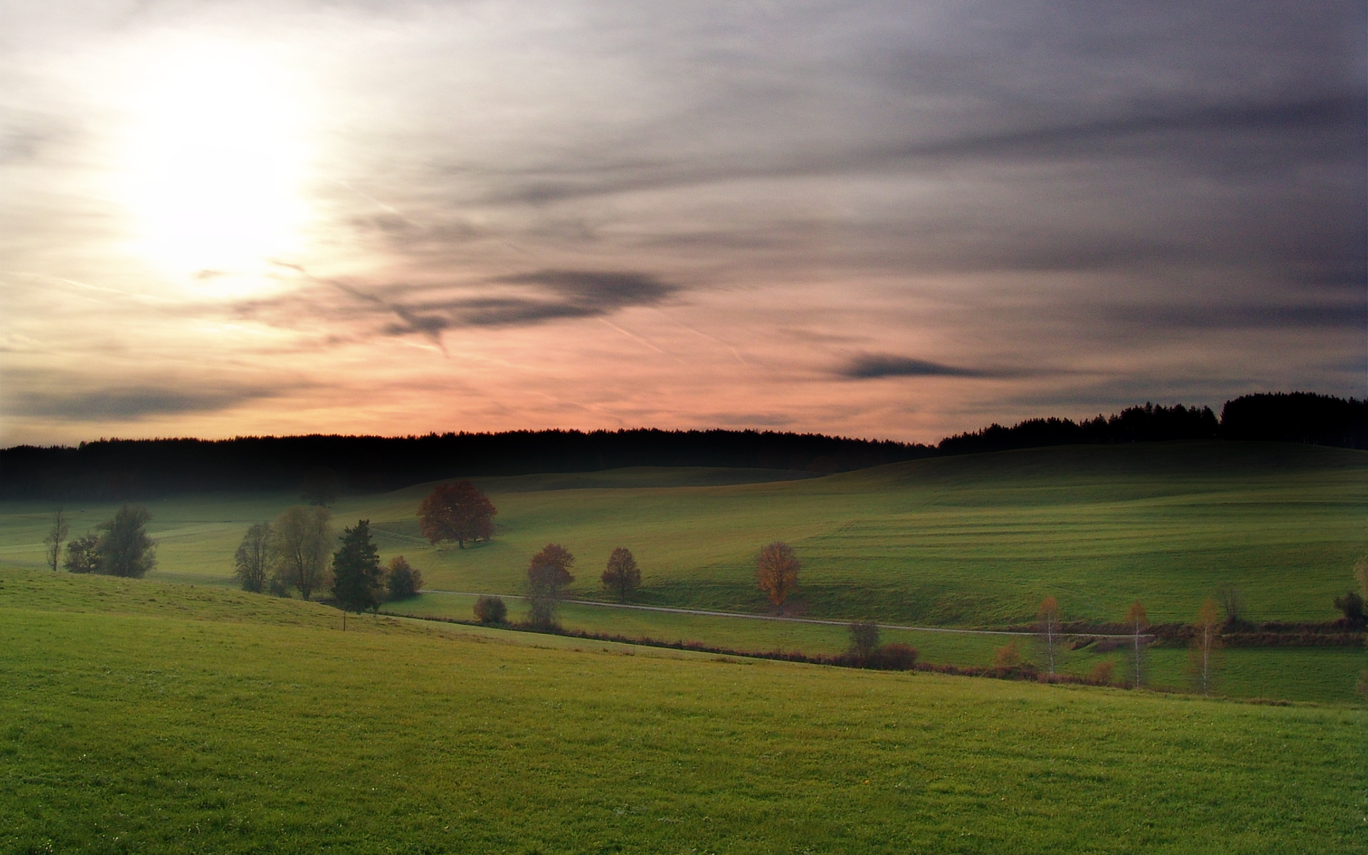 Description: A green field with a fence and trees on it at sunset with a cloudy sky above it and a line of trees on the other side of the field.