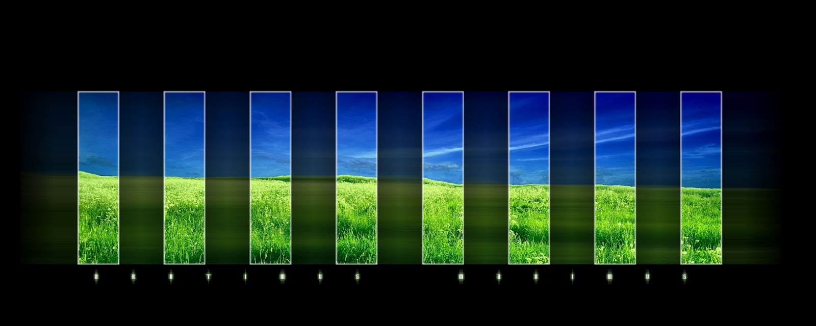 Description: A green field with a blue sky and clouds in the background with a line of vertical bars in the middle.