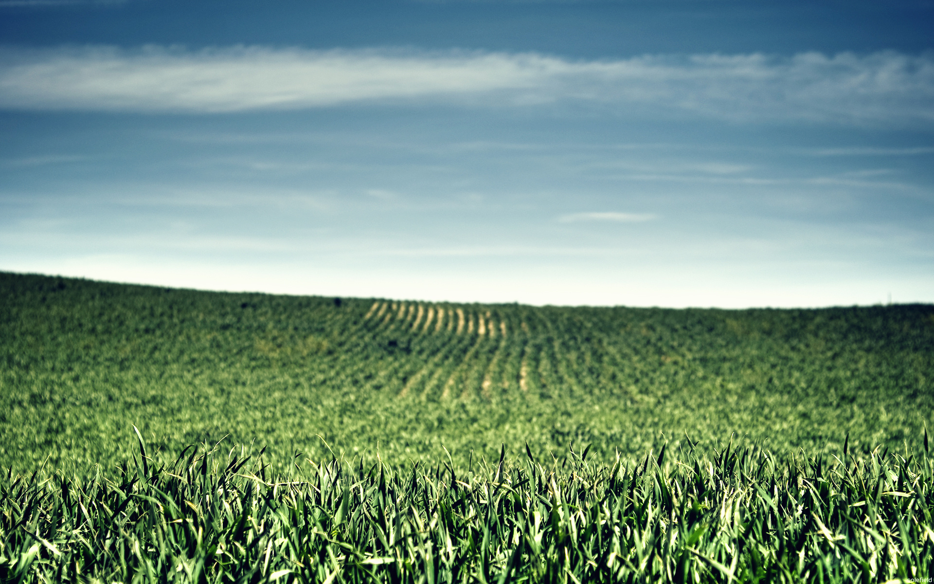 Description: A field of green grass with a blue sky in the background and a row of trees in the foreground.