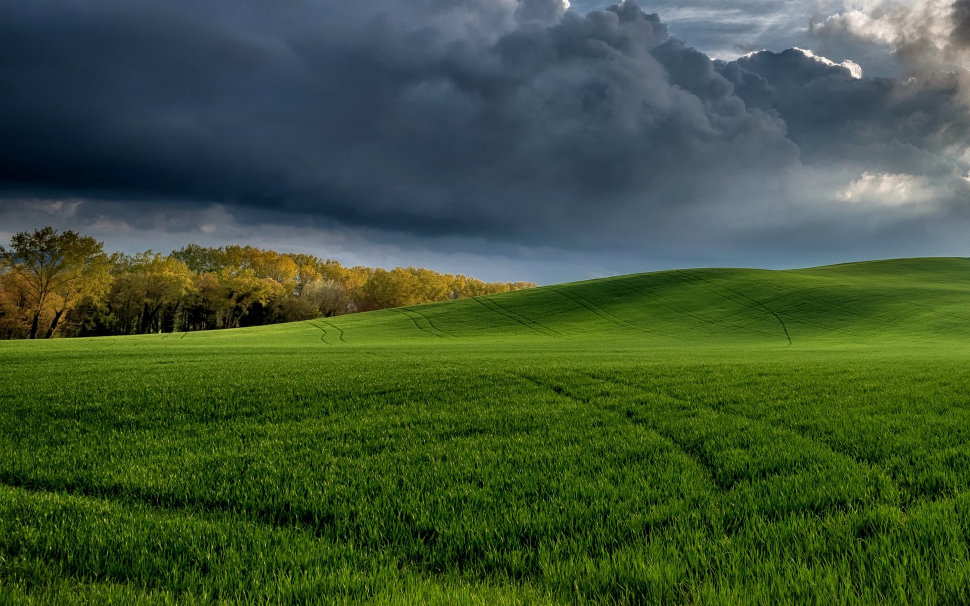 Description: A green field with a dark sky in the background and a few clouds in the sky above it.
