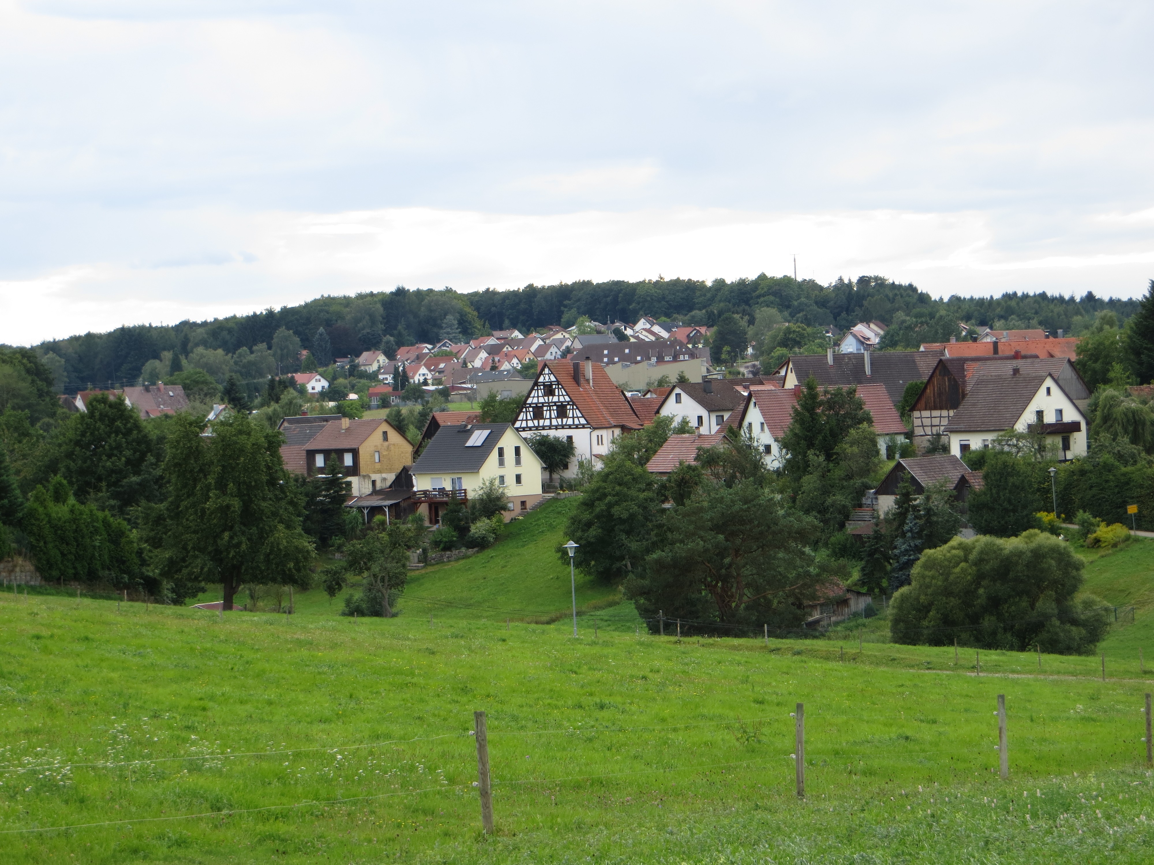 Description: A green field with houses on a hill in the background and a fence in the foreground with a few trees on the other side.