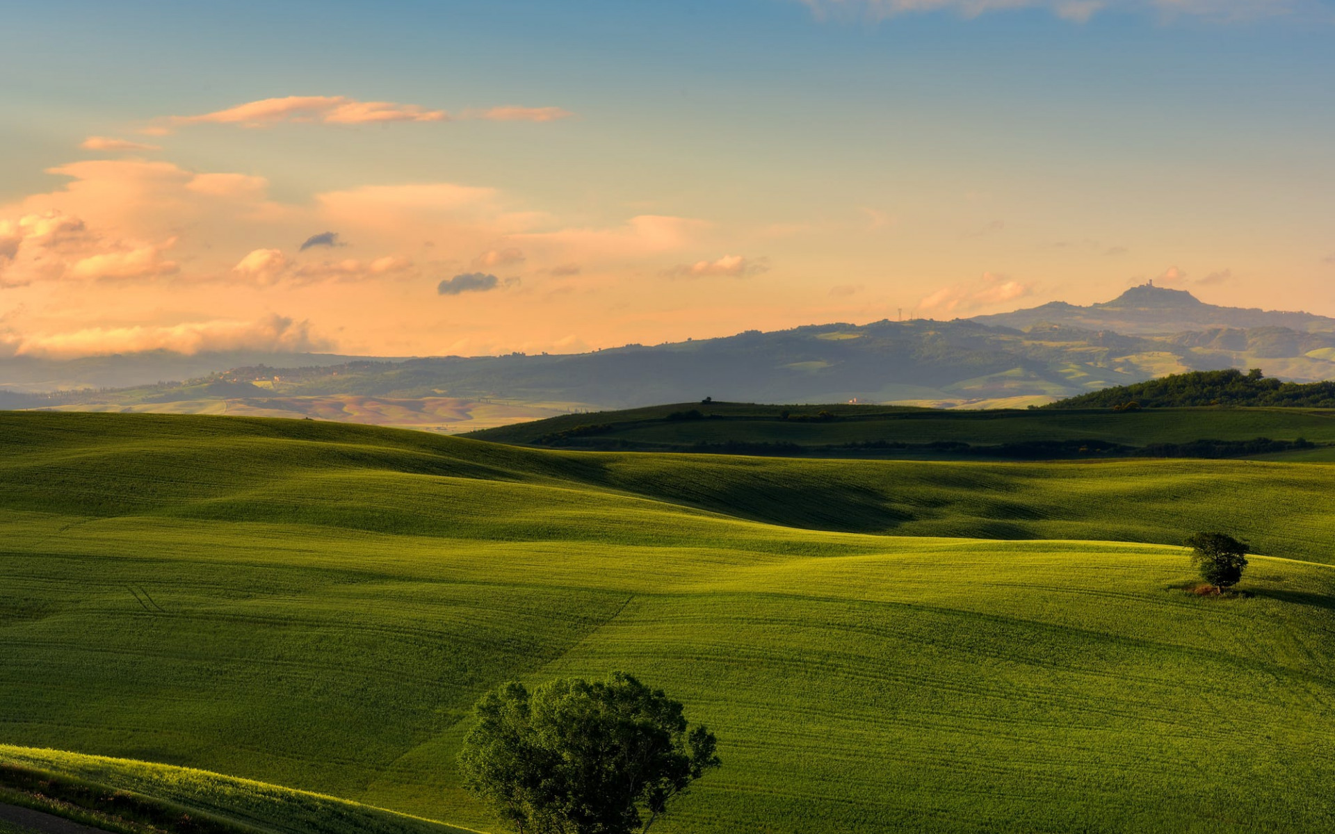 Description: A green field with a lone tree in the middle of it and mountains in the distance in the distance.